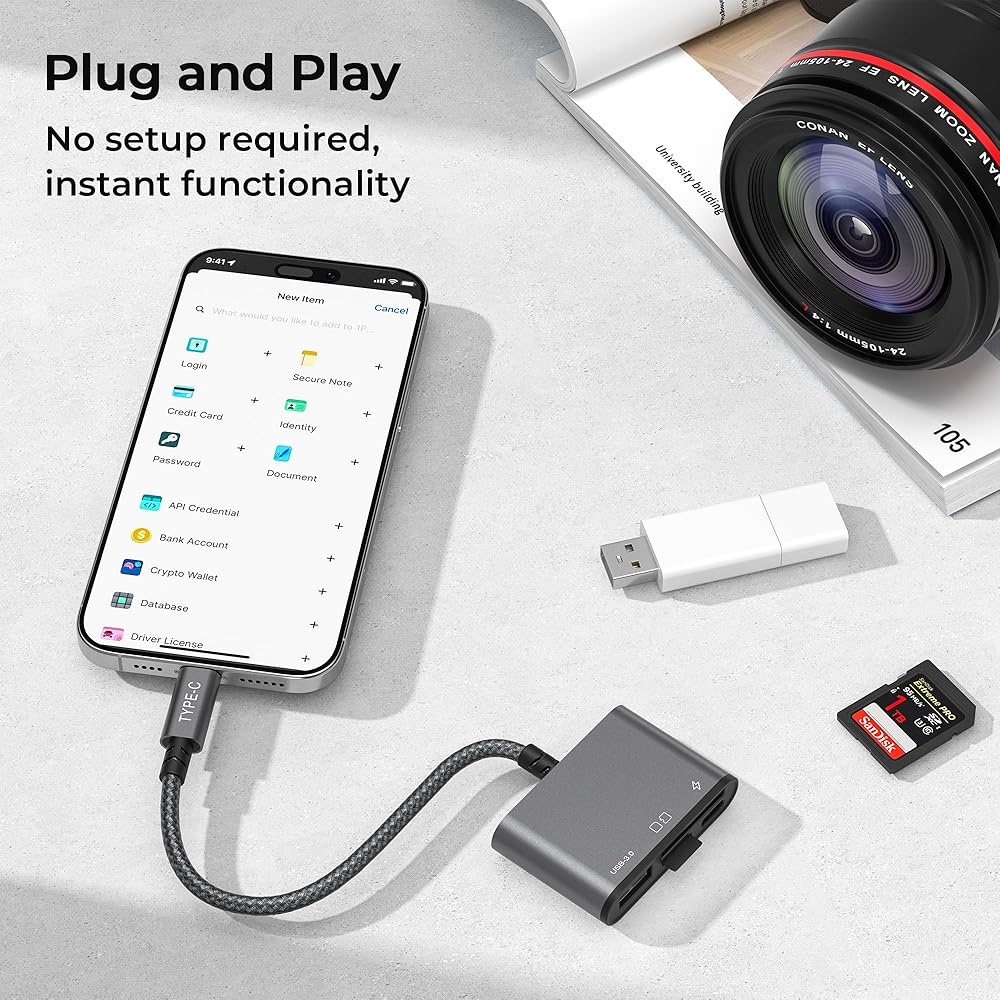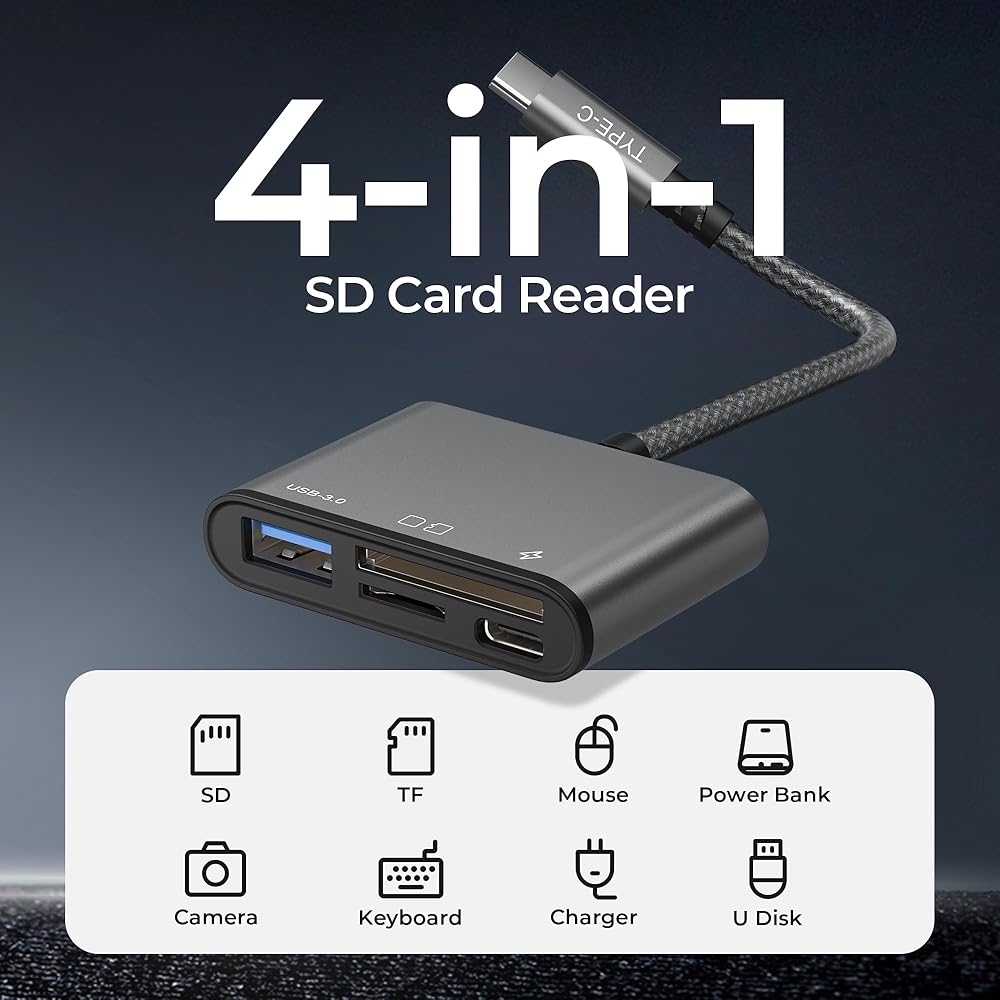 قارئ بطاقة SD USB C من Basesailor لهاتف iPhone 16 15 Pro Max، محول بطاقة ذاكرة 4 في 1 من النوع C Micro SD TF مع USB 3.0 ومنفذ شاحن لأجهزة Apple iPad 10 Air 5 Mini 7 6، الكاميرا، MacBook، الكمبيوتر الشخصي، Android، Samsung S24