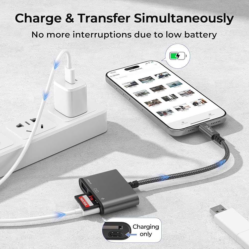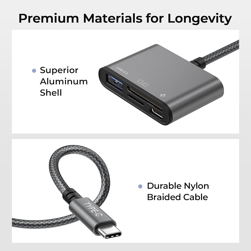 الشحن المتكامل ونقل البيانات: مزود بمنفذ شحن USB-C (للشحن فقط)، يسمح لك هذا القارئ بشحن جهازك أثناء نقل البيانات. استمتع باتصال سلس دون القلق بشأن نفاد طاقة جهازك.