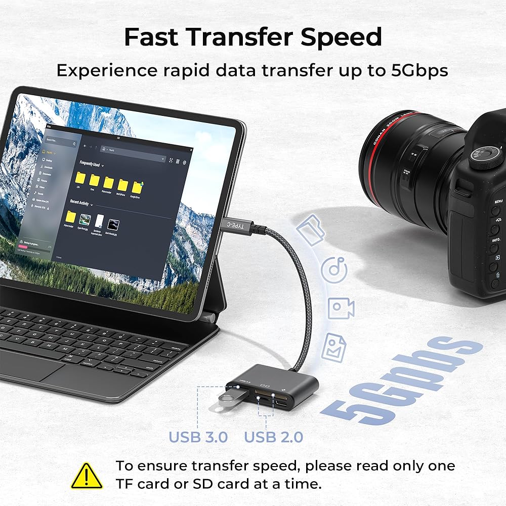 نقل بيانات عالي السرعة: مع منفذ USB 3.0 (فقط لنقل البيانات)، يوفر قارئ البطاقات هذا سرعات نقل بيانات تصل إلى 5 جيجابت في الثانية، مما يجعله مثاليًا لنقل الصور عالية الدقة ومقاطع الفيديو عالية الدقة وملفات الموسيقى وغيرها بسرعة. وثائق كبيرة.