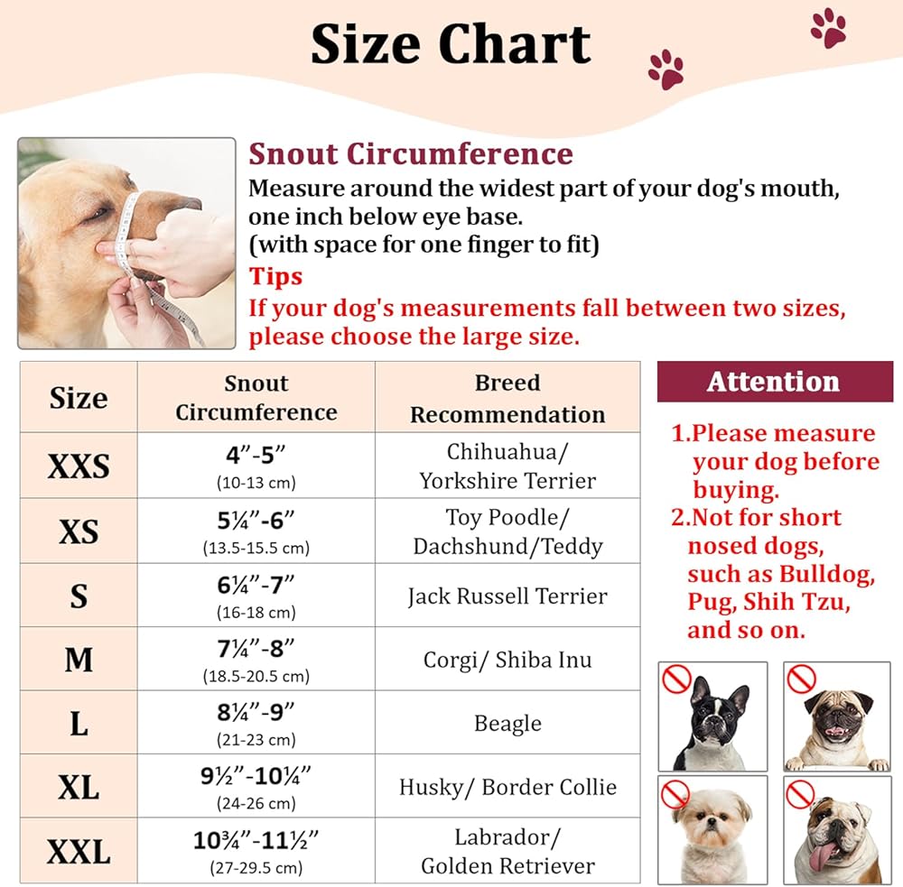 تنبيه: المقاس لا يتوافق مباشرة مع سلالة حيوانك الأليف أو وزنه. يرجى القياس قبل الشراء. عندما تتلقى الكمامة الناعمة لكلب كبير الحجم، تأكد من أنها كبيرة بما يكفي للسماح لكلبك باللهث وأنها آمنة أثناء ارتدائها. إذا كانت هذه هي المرة الأولى التي يرتدي فيها كلبك غطاء فم الكلب، فيرجى تقديمه لكلبك مع المزيد من المكافآت، وسيكون أكثر تقبلاً.