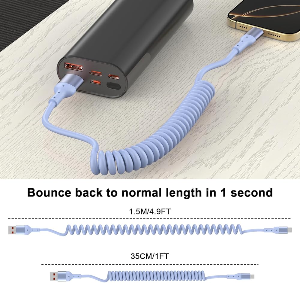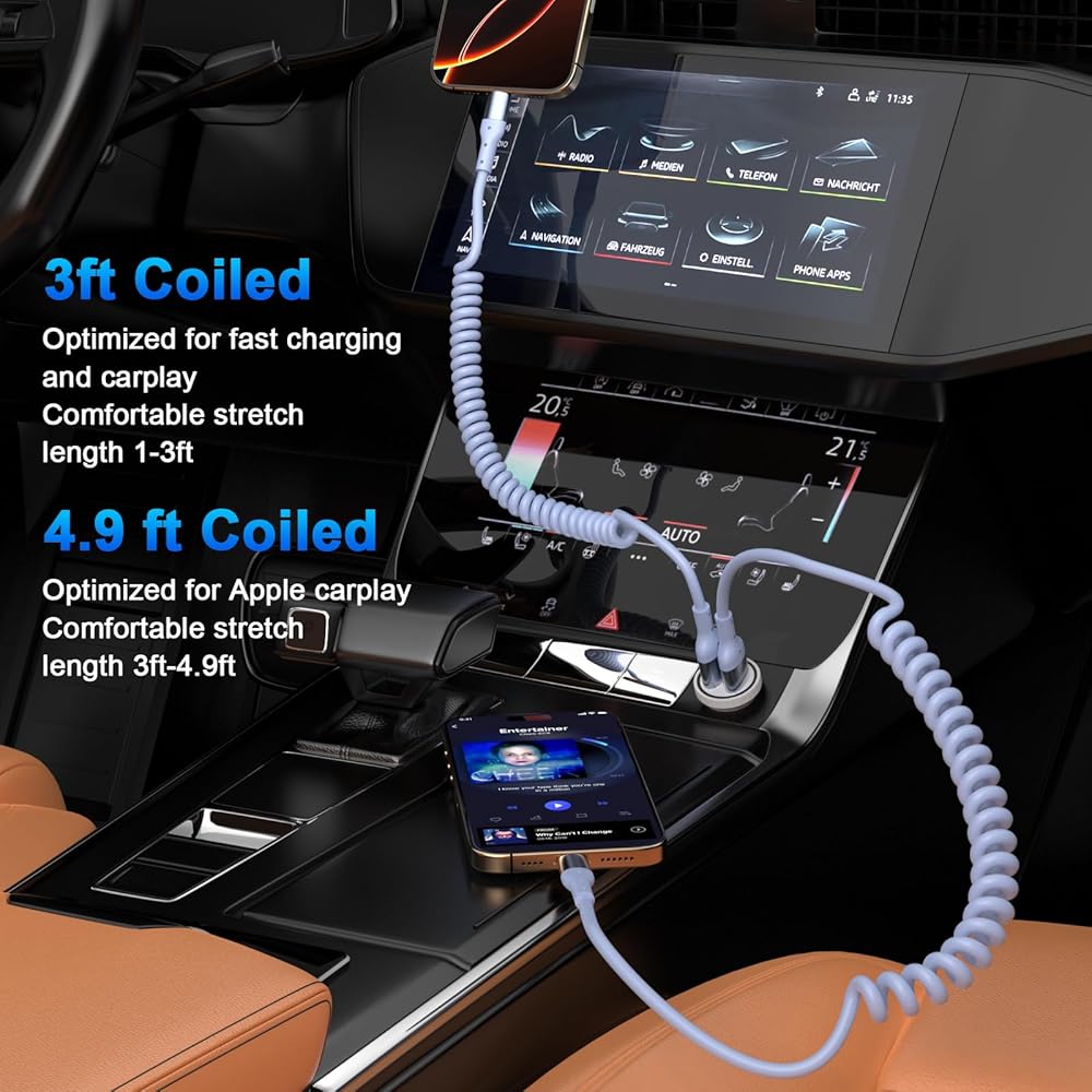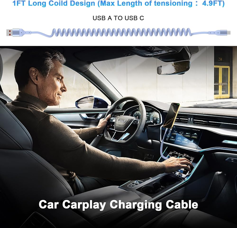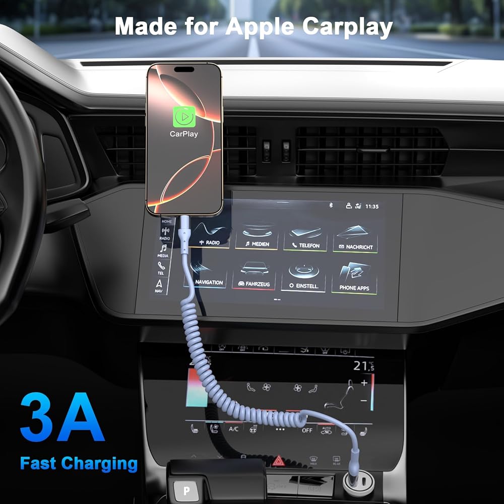 【ملفوف وموفر للمساحة】 كابل CarPlay قابل للسحب للشحن السريع لهاتف iPhone 16 بتصميم على شكل زنبركي، محمول وغير متشابك، مما يجعله صغير الحجم وموفر للمساحة وسهل الحمل وخالي من العقد، مثالي لسيارتك.