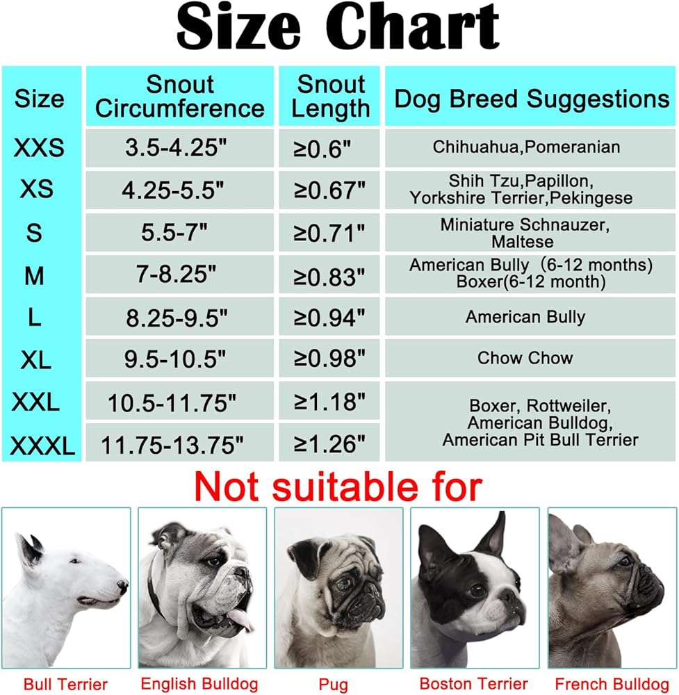 • كمامة كلب كبيرة جدًا مصممة للكلاب الكبيرة: كمامة الكلاب الكبيرة هذه مناسبة للكلاب الكبيرة التي يبلغ محيط خطمها 9.5-10.5". هذه الكمامات للكلاب ذات السلالات الكبيرة مناسبة لتشاو تشاو وما إلى ذلك. لصنع كمامة ناعمة بالنسبة للكلب الكبير الذي يناسب كلبك تمامًا، يرجى قياس المقاس قبل الشراء.