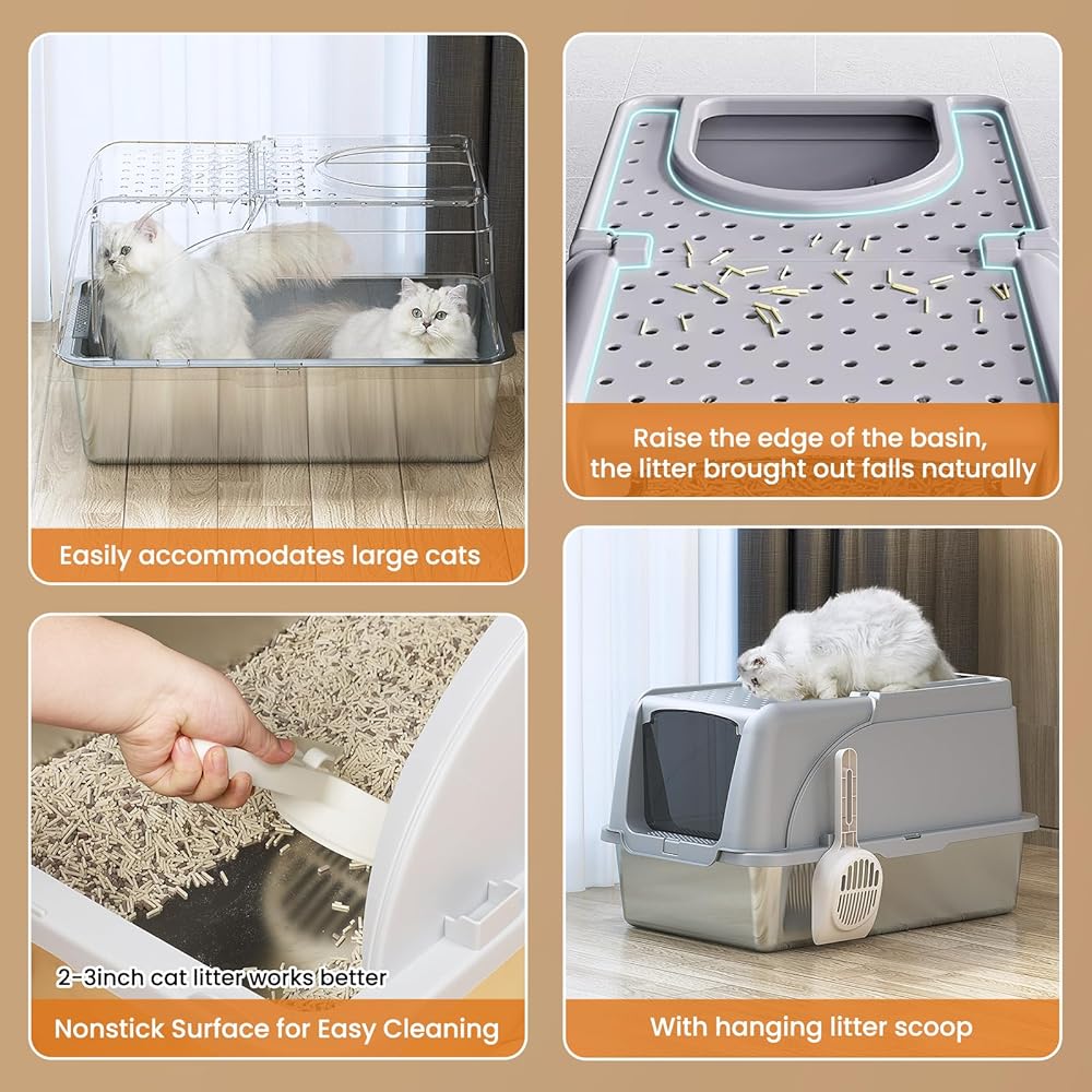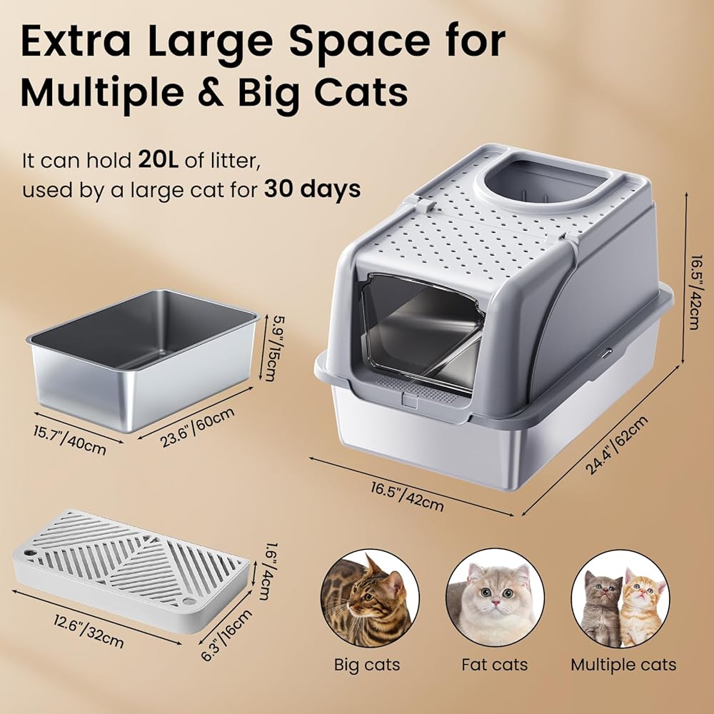 Large size and high capacity: The super size stainless steel litter box is 23.6 "X16" X16 ", when the cat is doing private things, you can move enough space in the litter box, stainless steel litter box can hold more than 20 liters of litter, providing spacious space for large cats, while suitable for cats of all sizes, super size is the best choice for multi-cat families