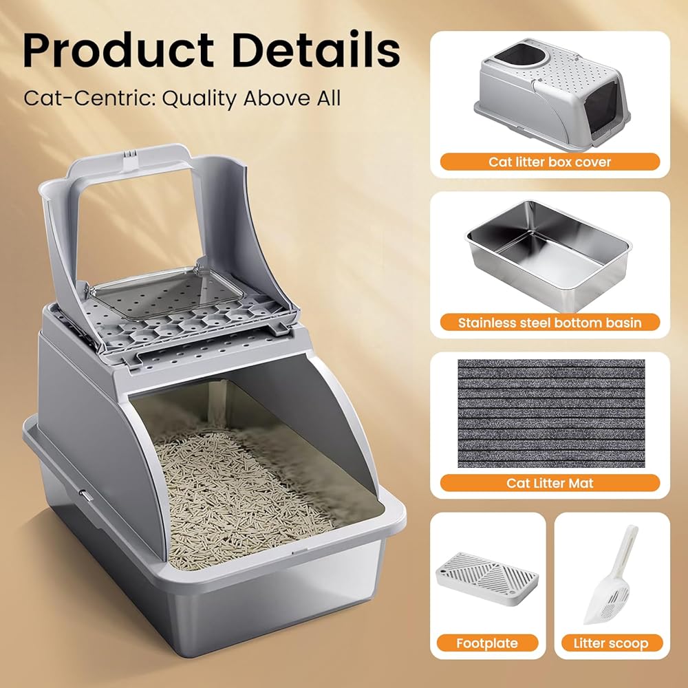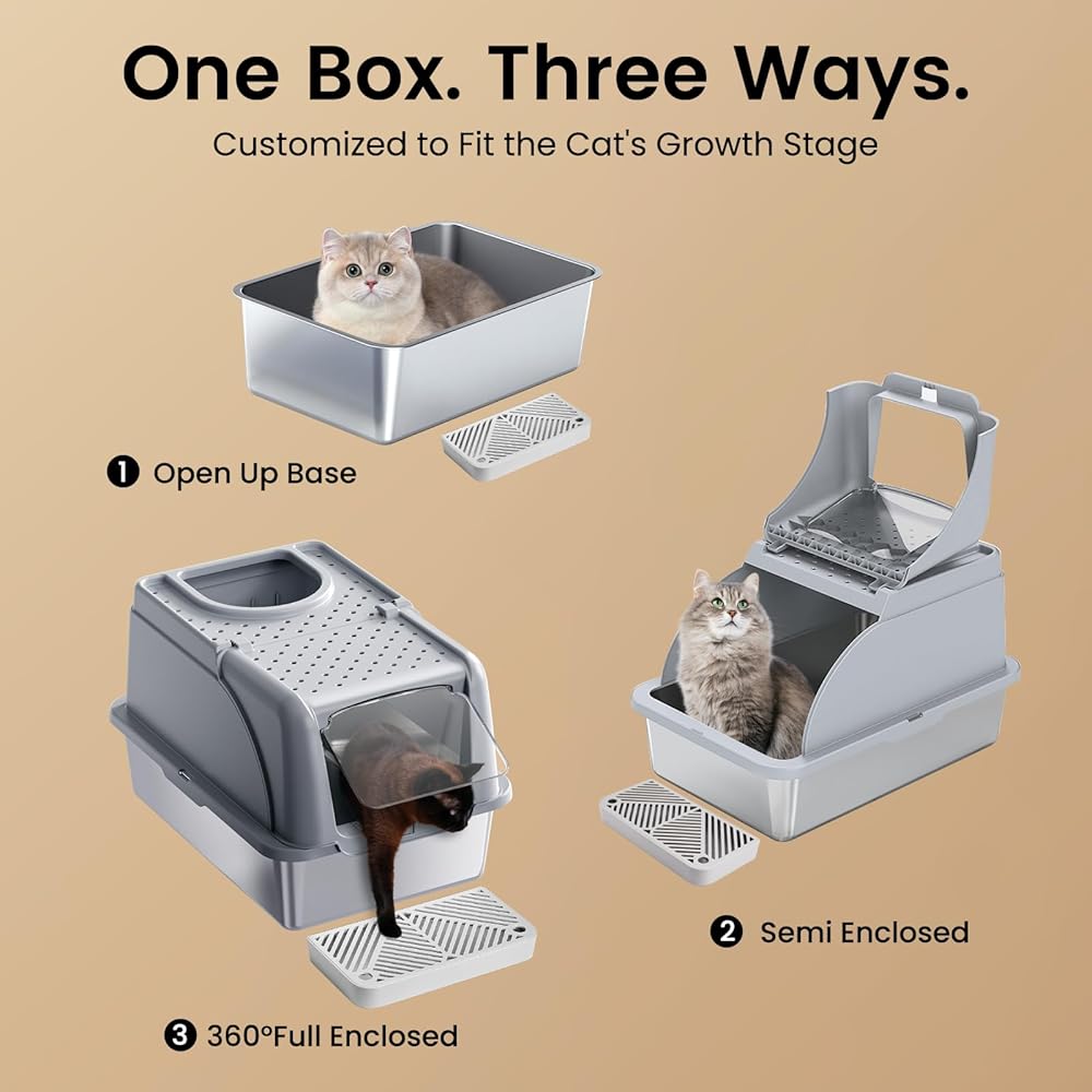 Dual entry option: Customize your cat's entry and exit experience with adjustable snapshot Settings. According to the different characteristics and physical conditions of the cat, choose to enter the litter box or the front litter box. The stainless steel litter box features a modular system that is easy to assemble and is available in both closed and semi-closed configurations to meet a variety of needs