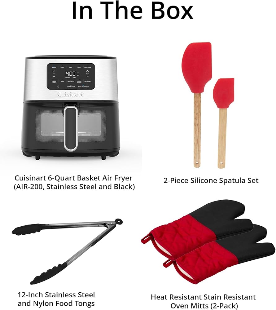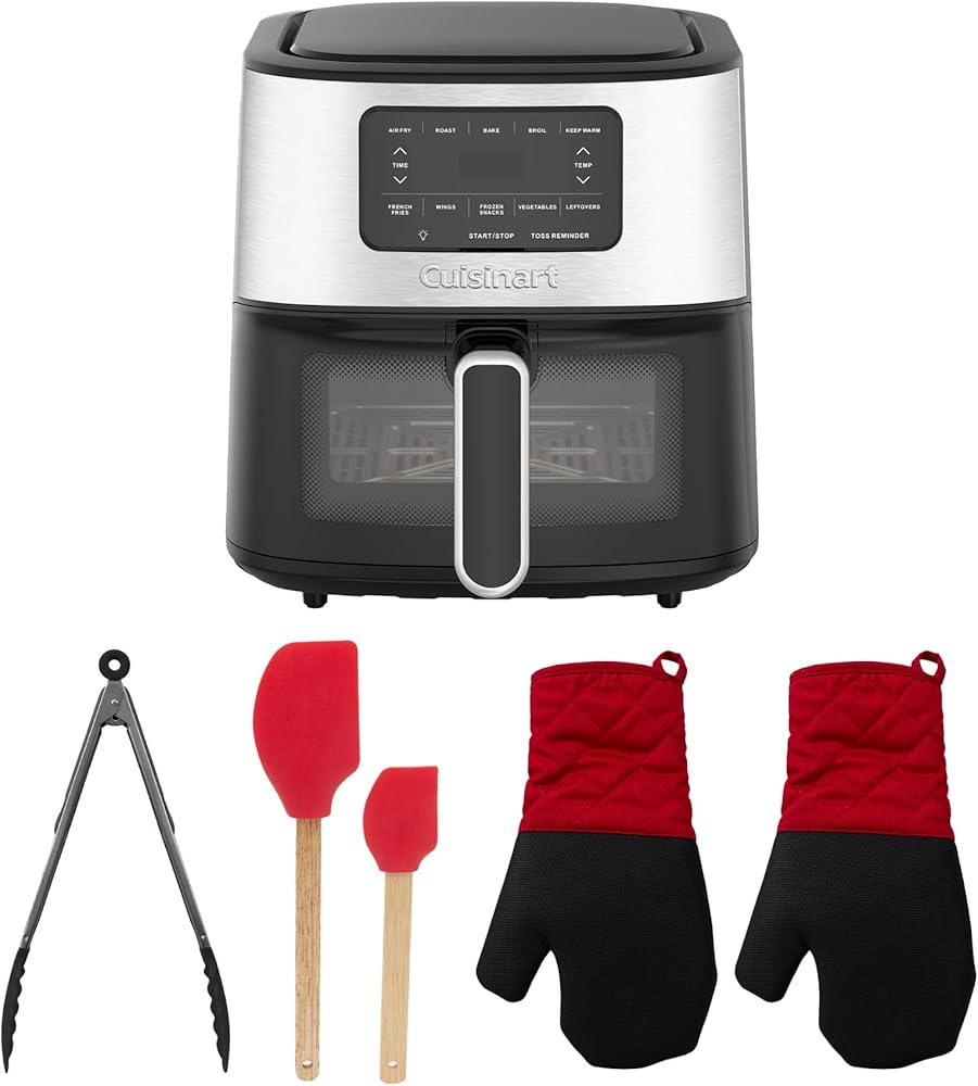Bundle Includes: Cuisinart Temperature Control, Stainless Steel and Black, Digital Display Basket Air Fryer, Achim Home Furnishings Buffalo Check Heat Resistant Stain Resistant Oven Mitts (Gray, 2-Pack), HDS Trading 2-Piece Silicone Spatula Set, and Baker's Secret 12-Inch Stainless Steel and Nylon Food Tongs (Black)