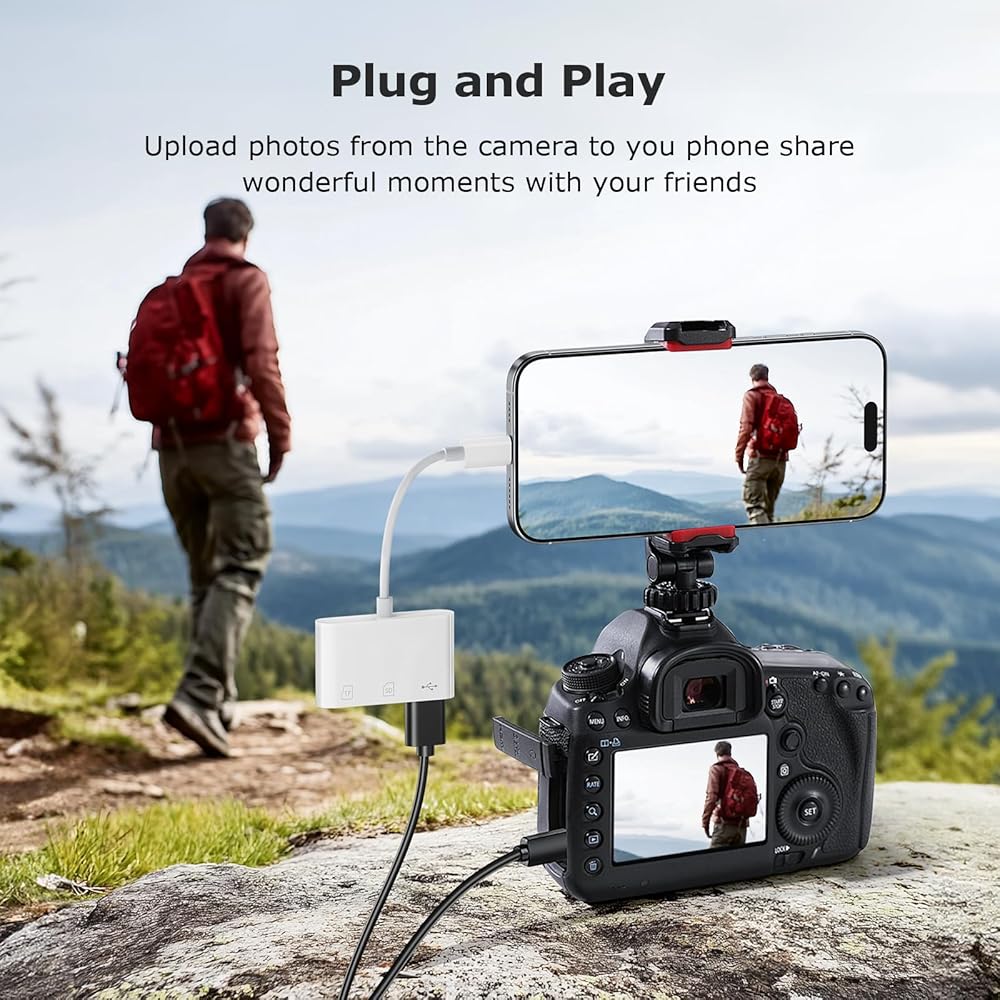 محول كاميرا USB C إلى USB، قارئ بطاقة SD لهاتف iPhone 15 16 Series 3 في 1 محول بطاقة الذاكرة مع فتحات بطاقة مزدوجة ومنفذ USB لأجهزة iPhone/iPad/Mac/الكمبيوتر المحمول/Android Trail قارئ بطاقات التوصيل والتشغيل
