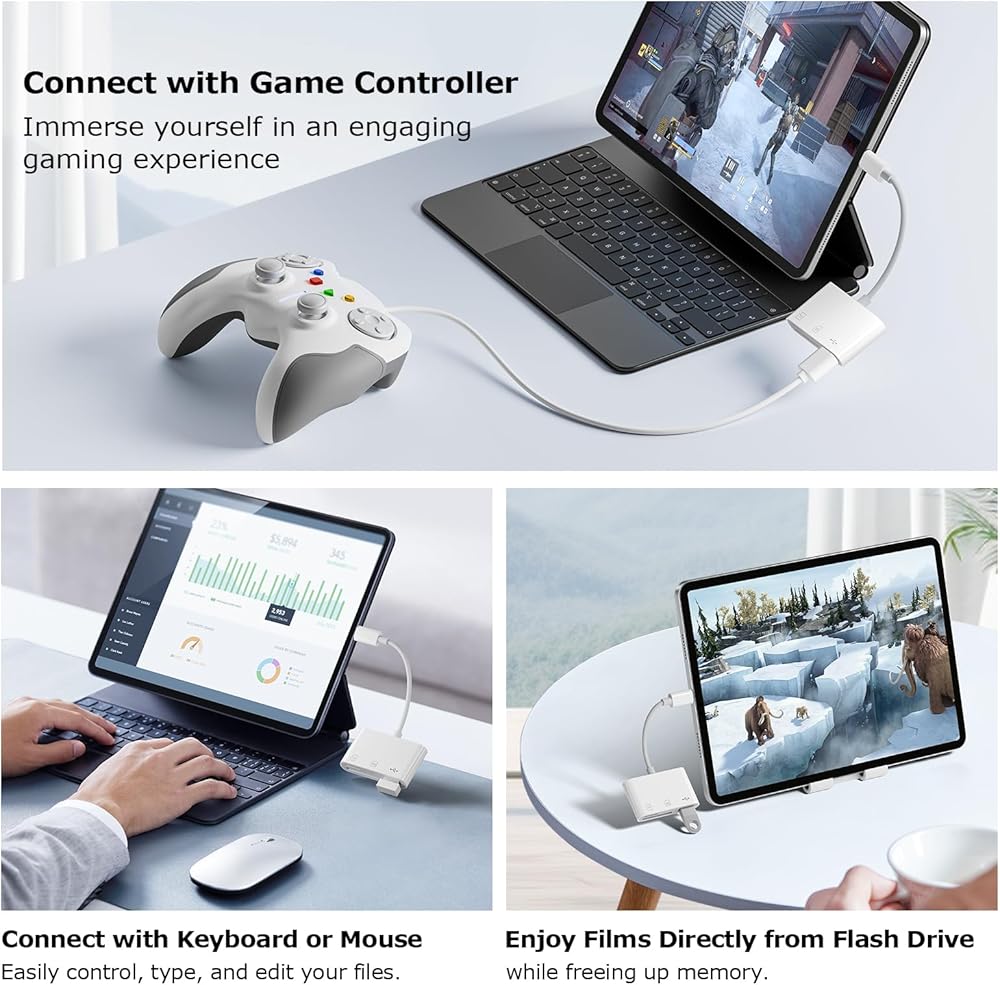 • 【أداء مكتبي ممتاز】كابل قصير خفيف وموثوق به وأداء أفضل. باستخدام محول iPad USB هذا، يمكنك توصيل لوحة مفاتيح الكمبيوتر أو الماوس مباشرة بجهاز iPad، مما يحسن سرعة الكتابة والإنتاجية.