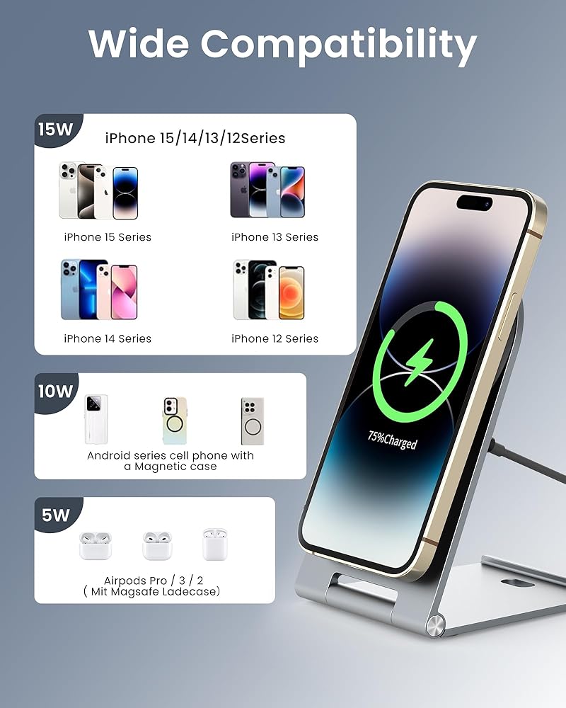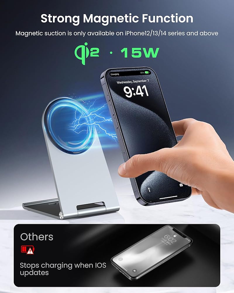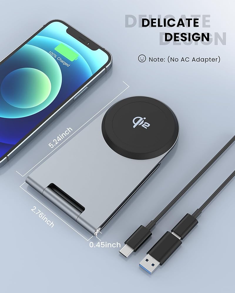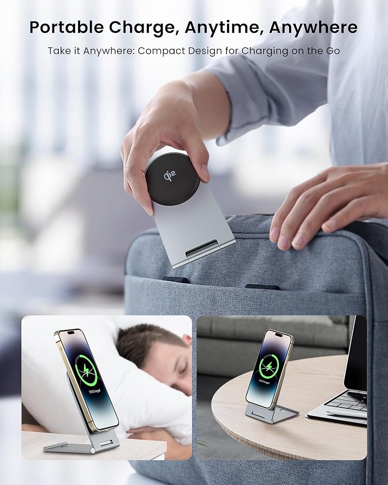 • تصميم محمول: يعمل حامل الشاحن اللاسلكي على رفع مستوى الشحن الخاص بك من خلال تصميمنا المبتكر القابل للطي، وهو مثالي للسفر. يمكن وضعها بسهولة في أي حقيبة، مما يضمن إمدادك بالطاقة دائمًا. يُعد الشاحن اللاسلكي Mag-safe مثاليًا للمنزل أو أثناء التنقل، ويظل مشحونًا