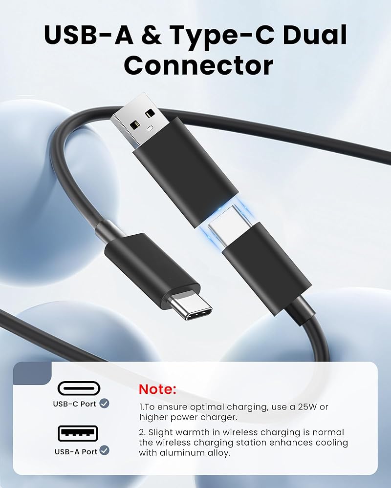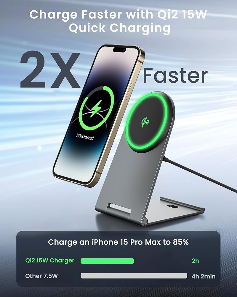 • شحن فائق السرعة بقدرة 15 وات: معتمد من Qi2 ومتوافق مع Mag-safe. شاحن لاسلكي سريع يعيد تعريف السرعة والأمان. تبديد الحرارة الفعال للشحن الآمن. تسمح محطة الشحن اللاسلكية للهاتف بحرية أثناء الشحن في المنزل أو المكتب أو أثناء التنقل
