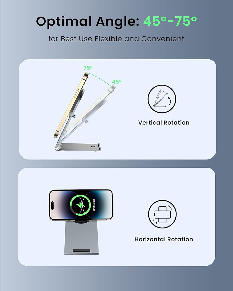 • ضبط زاوية مريح: يدعم الشاحن اللاسلكي 45 درجة -75 درجة للأوضاع الأفقية والعمودية، وهو مثالي لـ FaceTime ومقاطع الفيديو. يتمتع شاحن iPhone اللاسلكي بالشحن بدون استخدام اليدين بالزاوية المفضلة لديك، مما يعزز تعدد الاستخدامات والراحة
