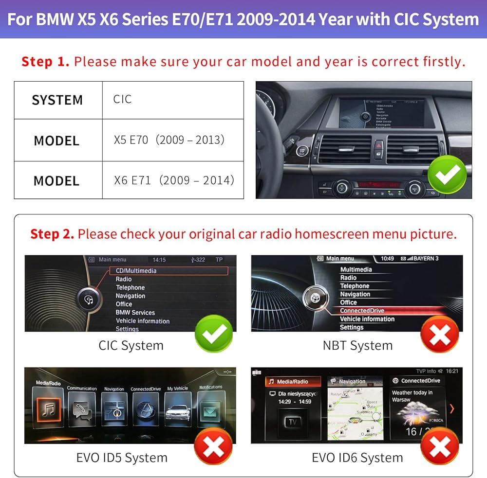 السيارة المناسبة: تناسب BMW X5 X6 Series E70/E71 2009-2013 سنة مع نظام CIC. لا يصلح للسيارة بدون شاشة سيارة المصنع. يرجى التحقق من صورة موقعنا للتأكد أولاً