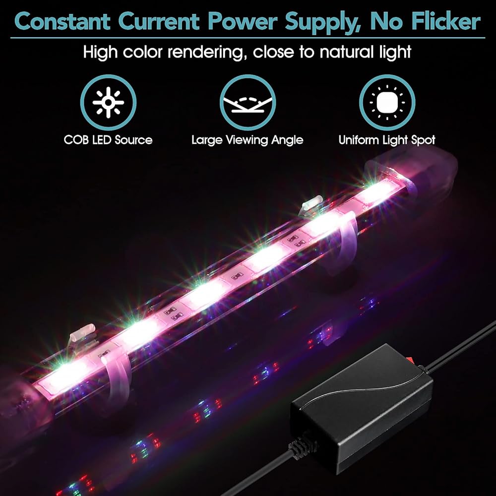 🐟【مصدر LED COB】يستخدم ضوء حوض السمك هذا مصدر COB LED، الذي يتميز بتقديم ألوان عالية وزاوية رؤية كبيرة ونقطة إضاءة موحدة. الضوء قريب من الطبيعة، وهو ليس مفيدًا لنمو الحيوانات الأليفة المائية فحسب، بل يجعل حيواناتك الأليفة المائية تبدو أكثر تألقًا.