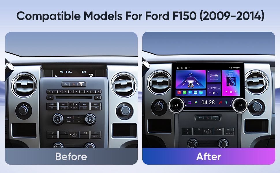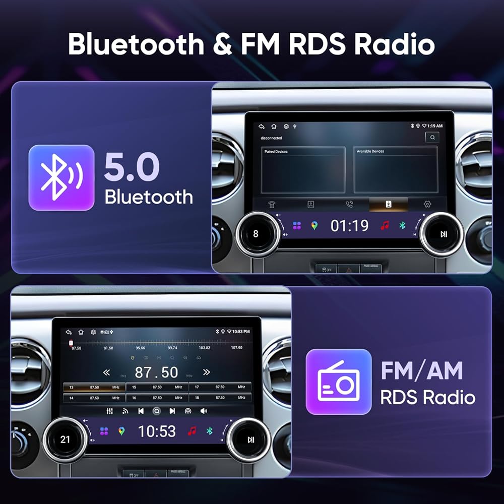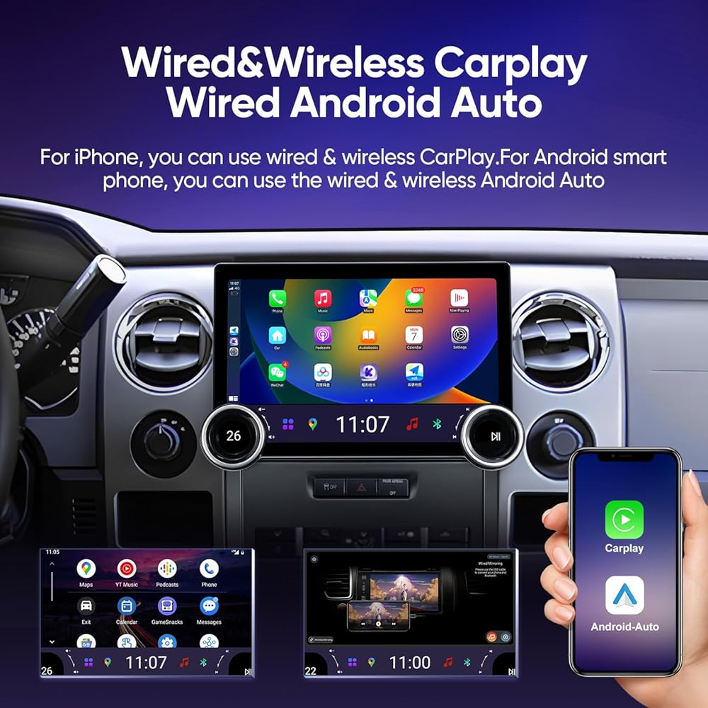 Apple CarPlay وAndroid Auto & Mirroring: راديو السيارة لـ F150 المزود بتقنية Apple CarPlay وAndroid Auto اللاسلكية يوفر وصولاً سلسًا إلى المكالمات والرسائل والموسيقى والملاحة. يدعم الاتصالات السلكية واللاسلكية عبر البلوتوث أو USB، بالإضافة إلى انعكاس الشاشة لتعزيز التفاعل.