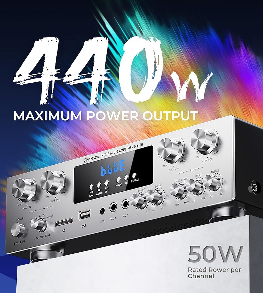 جهاز استقبال الصوت المنزلي ومكبرات الصوت اللاسلكية من Vangoa، 4 قنوات 440 وات، مضخم صوت ستيريو للمسرح المنزلي مع جهاز تحكم عن بعد، USB/SD/2 ميكروفون في Echo/EQ/LED/AUX/محدد FM لمكتب الاستوديو