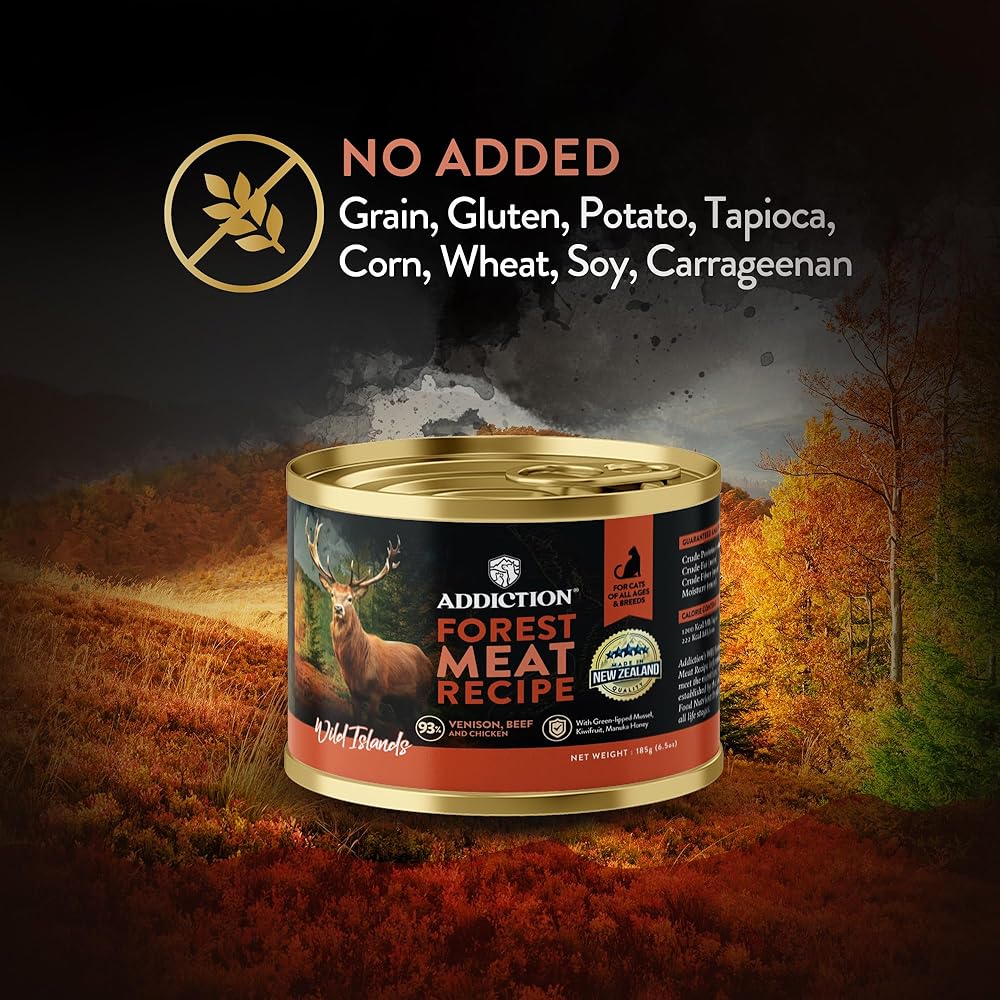 In the wild, cats thrive on a protein-rich and low-carbohydrate diet mirroring their ancestral diet. Forest Meat is always made with 93% animal ingredients and is free from grains, gluten, potato, tapioca, corn, soy, wheat, and carrageenan. Forest Meat features premium New Zealand Venison and Beef which are highly flavourful and palatable. Packed with nutrient-dense organ meats and antioxidant-rich Green-lipped mussels, Manuka Honey and Kiwifruit, Forest Meat offers your cats a nutritious, immune-boosting, whole prey-based diet.