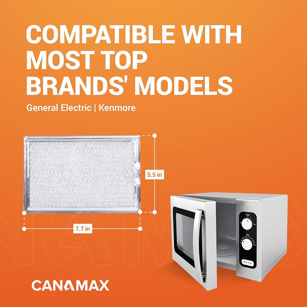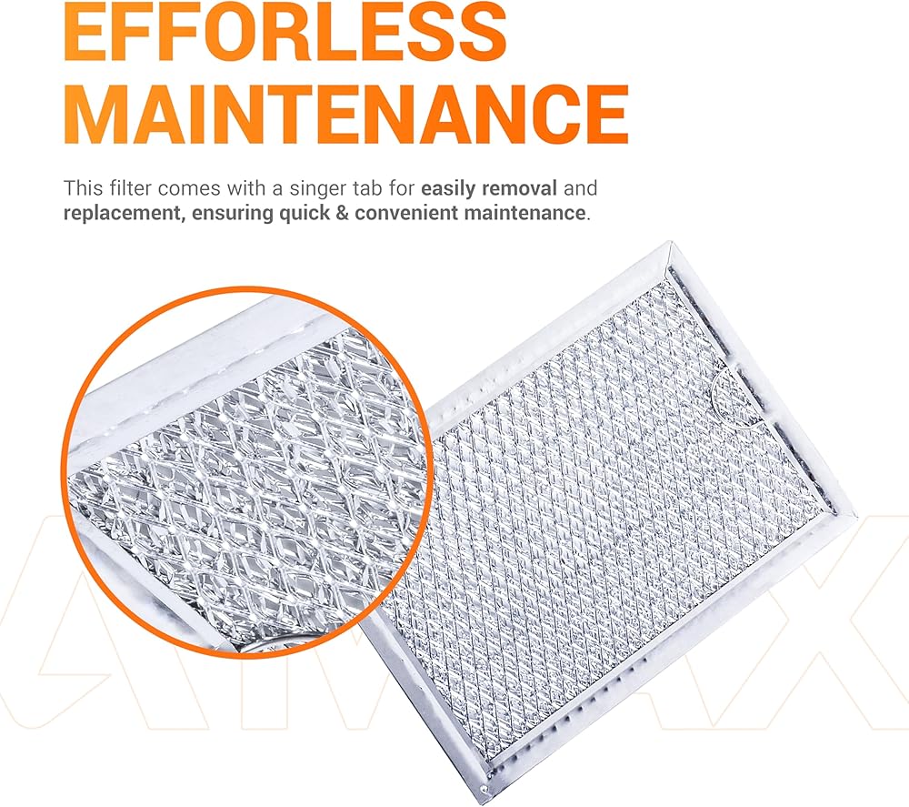 The WB06X10309 Microwave Oven Grease Filter is a genuine replacement filter for a microwave. It includes 2 filters. It is metallic in color and measures about 7.7 inches wide and 5 inches tall. It features a finger tab for easy removal and installation. This grease filter traps grease and odors from the exhaust air which will maintain the smell of your food and protect your appliance and air quality.