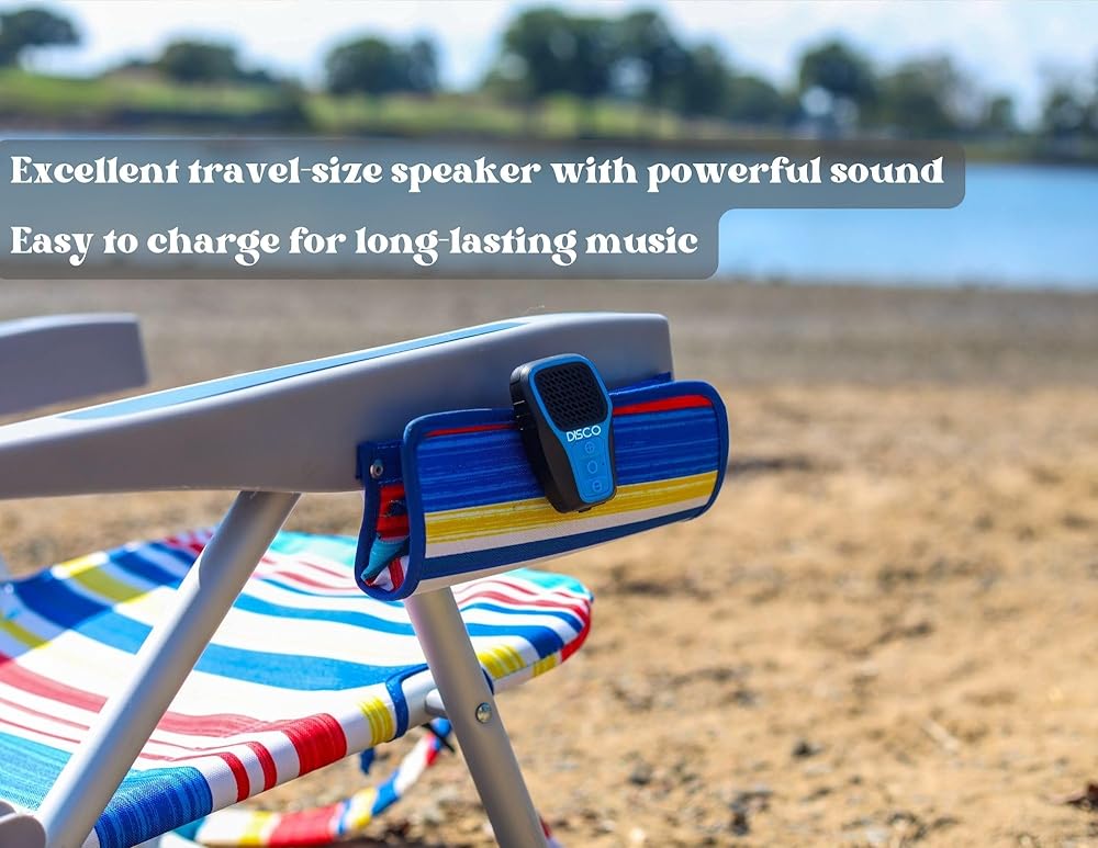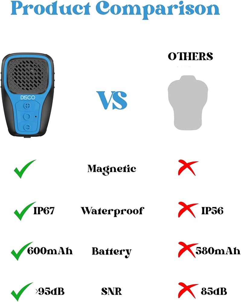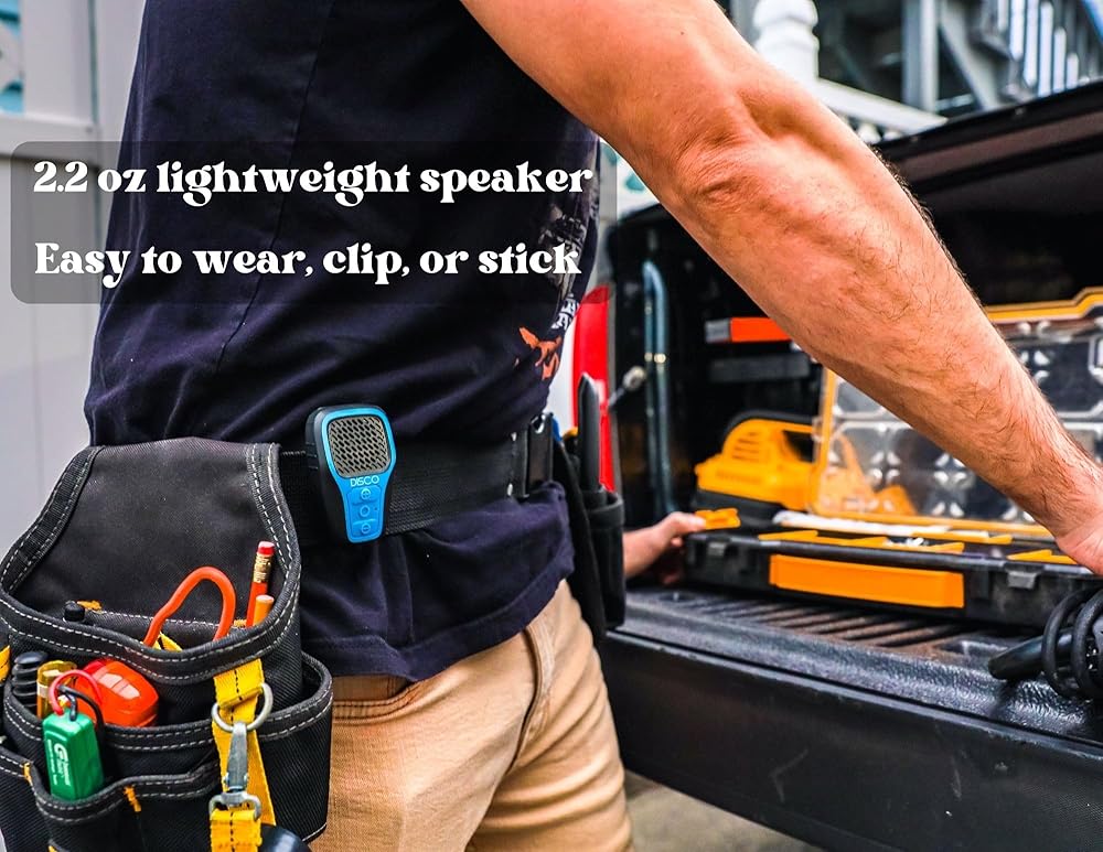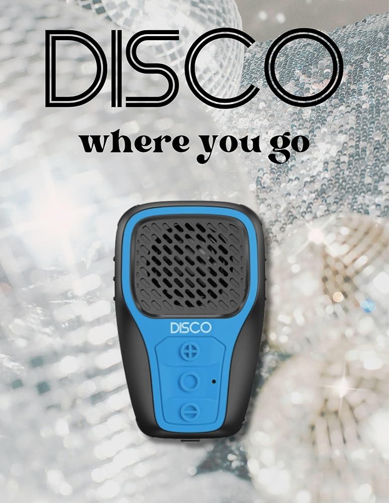 Mini bluetooth speaker from DISCO with sturdy clip and magnetic strip for hands-free music and calls. Listen to your favorite songs while you work at your jobsite, garden in your yard, or explore outside. Long-lasting and easy to pair and charge. This speaker is rated IP67 for waterproof capabilities and can play wirelessly from a distance of 10 meters/ 30 feet.