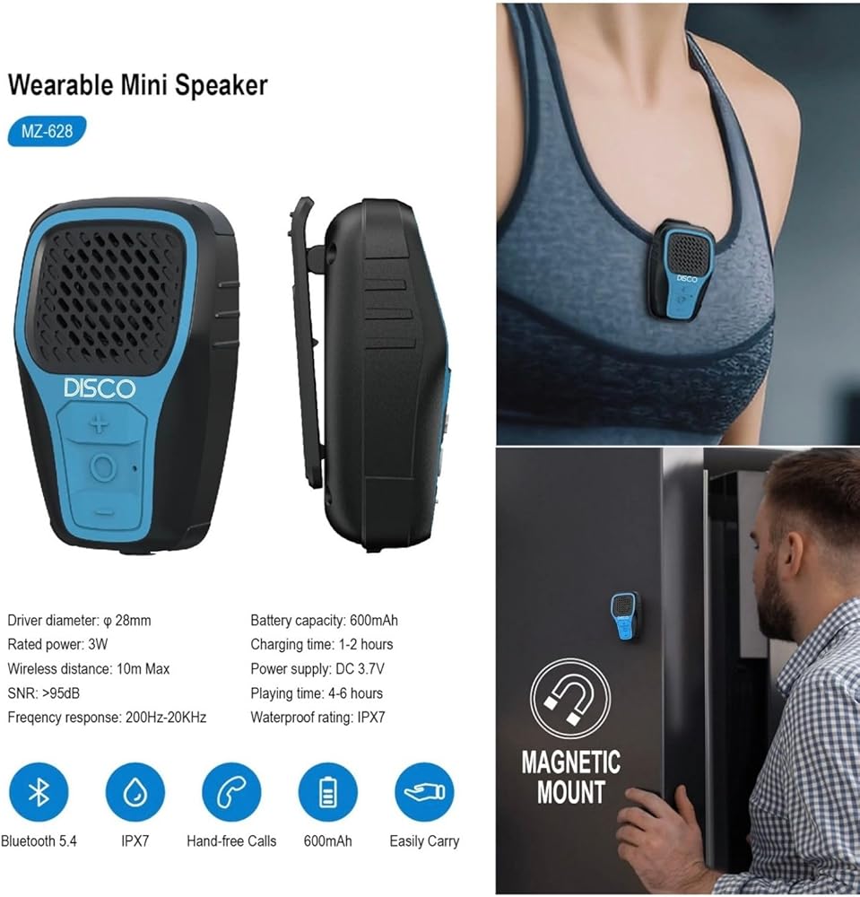 مكبر صوت بلوتوث يمكن ارتداؤه، مكبر صوت صغير محمول مغناطيسي ومقاوم للماء، مكبر صوت بمشبك لاسلكي مع ميكروفون مدمج، موسيقى بدون استخدام اليدين ومكالمات للعمل/الخارج/موقع العمل/ركوب الدراجات