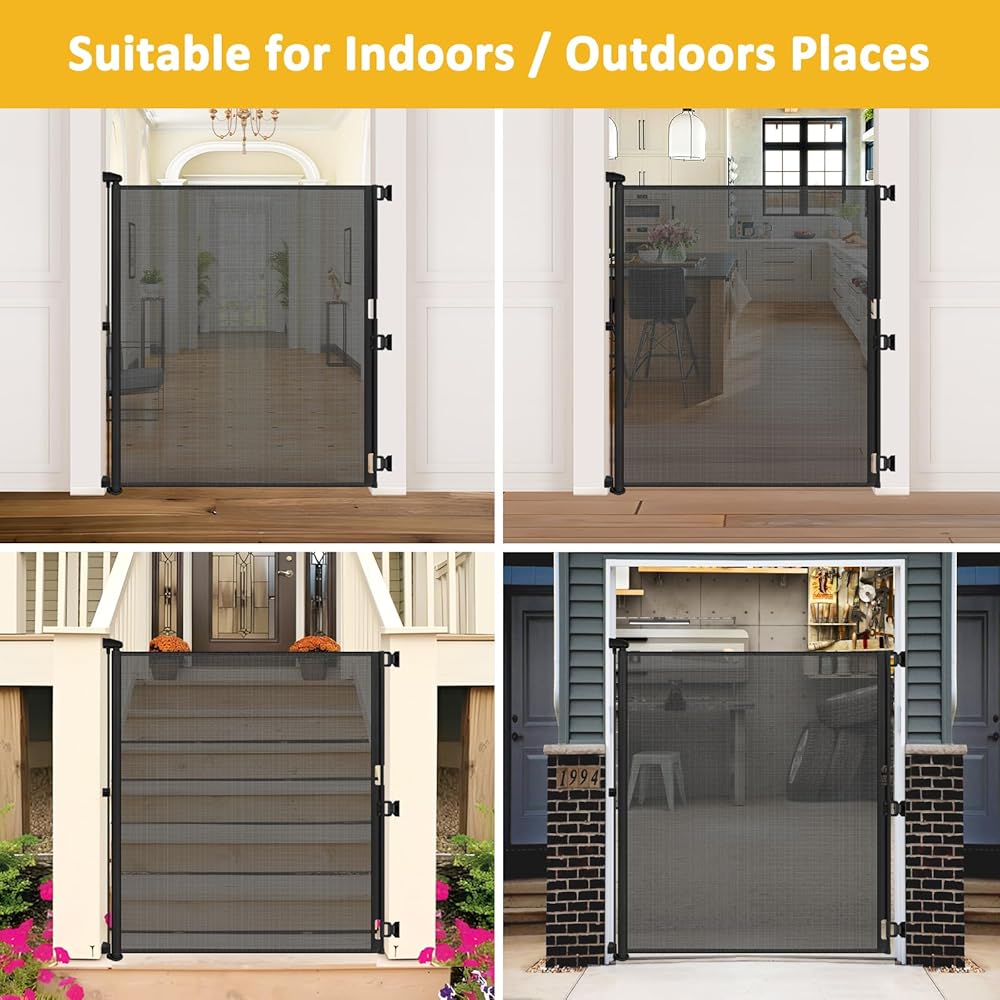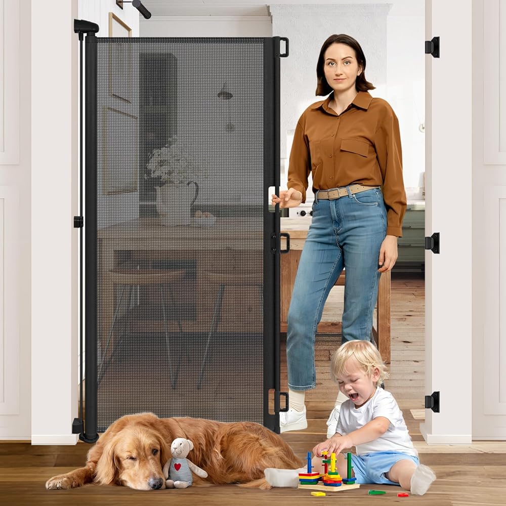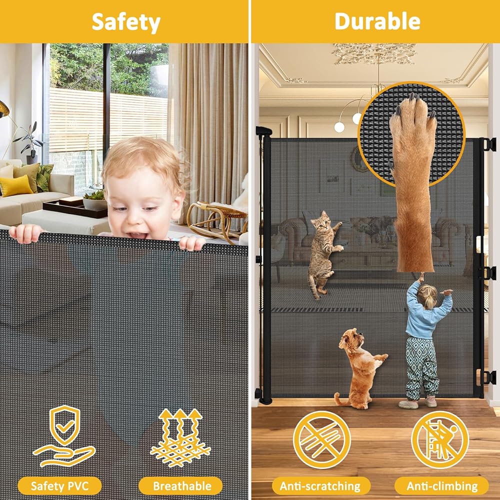 - Durable and Safe Mesh Material: The mesh is soft, anti-scratch and anti climbing. This chew proof extra tall baby gate is made of baby safety PVC material and breathable mesh. It's a safe choice for moms to buy our retractable baby gate