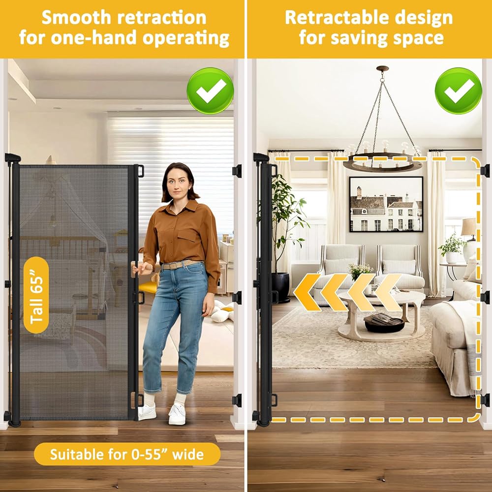 - 65 Inches Extra Tall Pet Gate: Our retractable dog gate is extend up to 55” wide and 65” height, which is tall enough for adults and no need to stoop to pull the gate