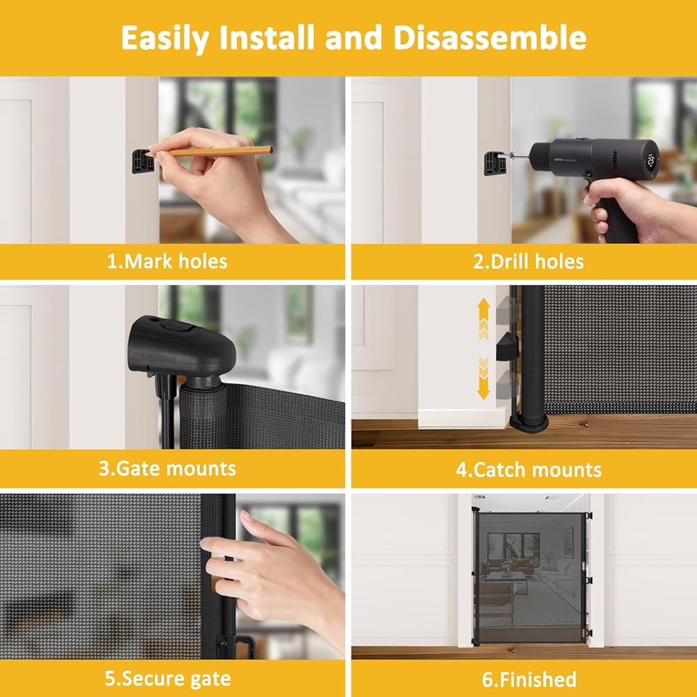 - Can be Disassembled and Change the Installation Position: Do not like the pressure mounted baby gate, this retractable pet gate is easy to install and disassemble. You can change the installation position freely and easily