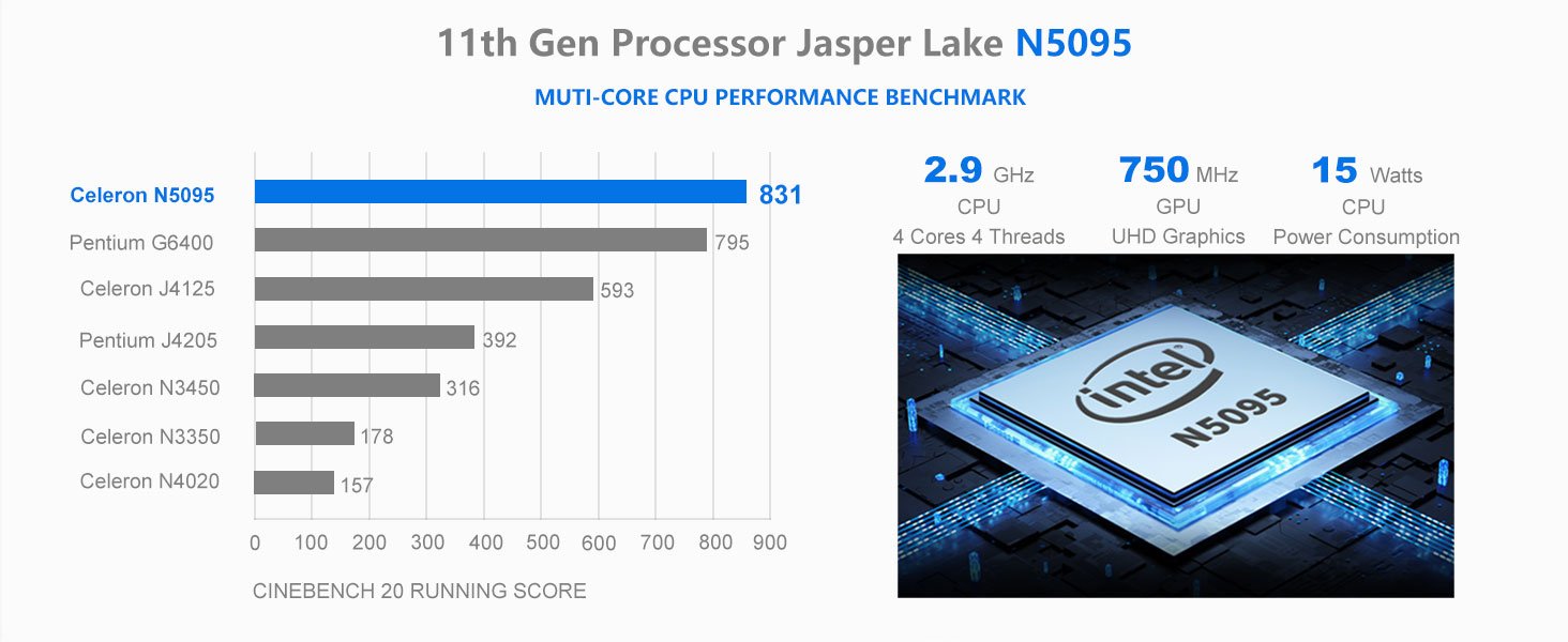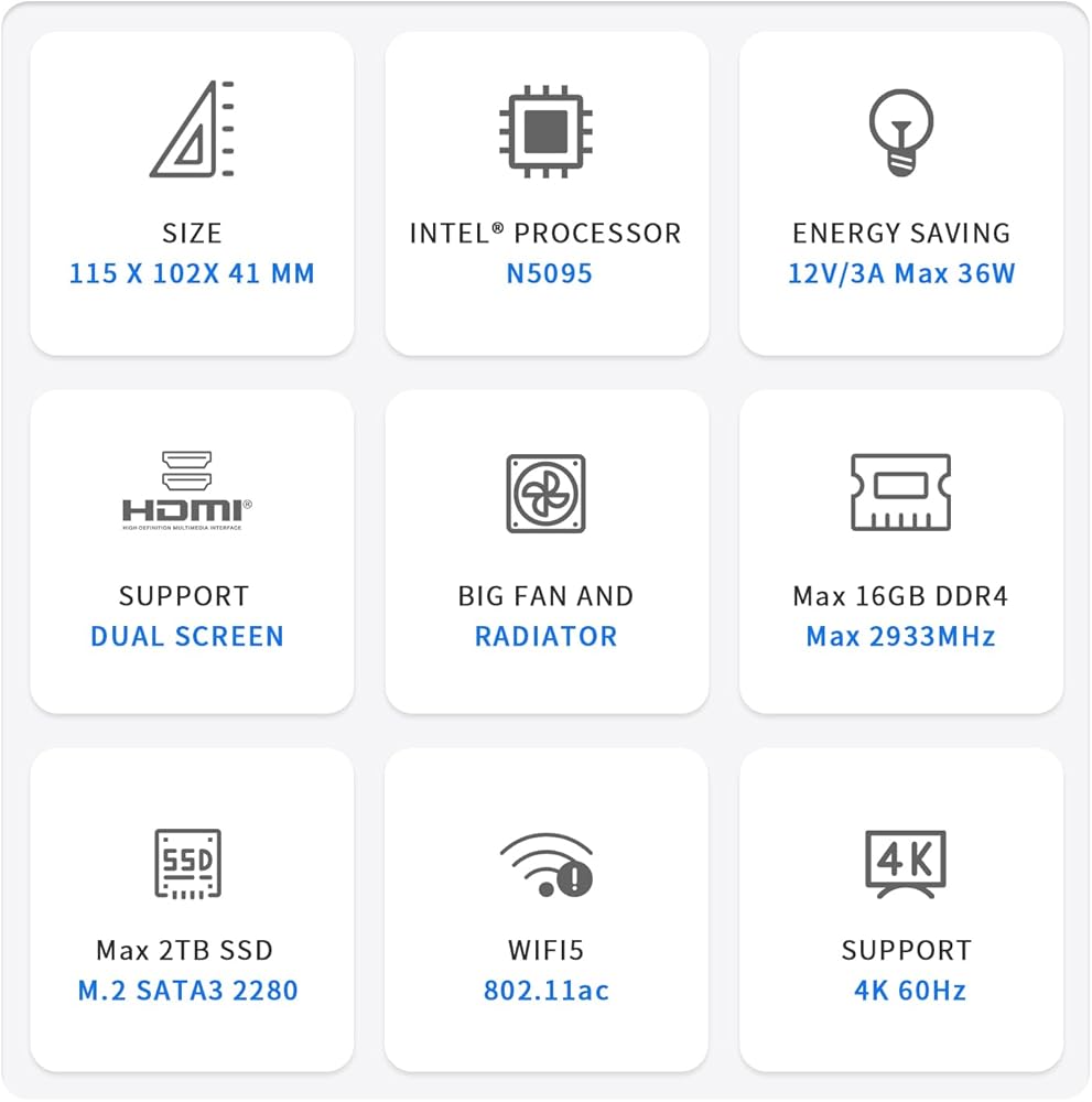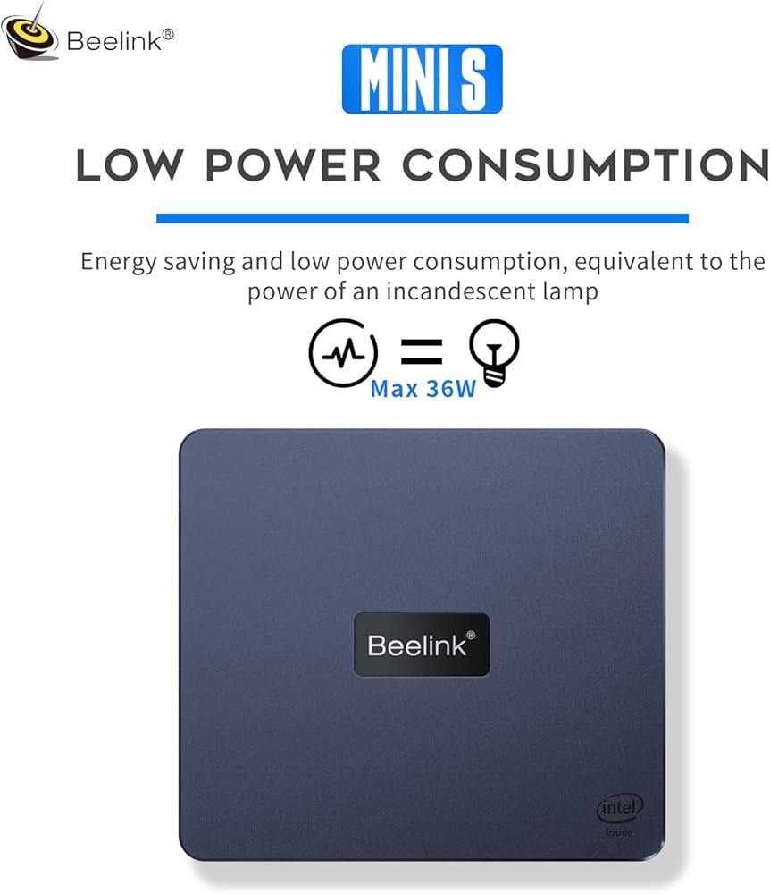 • معالج موفر للطاقة: يحمل Beelink minis معالج celeron N5095 (4C/4T، حتى 2.9 جيجا هرتز، 15 وات TDP). فهو يوفر أداءً بنسبة 30% تقريبًا مقارنة بالجيل السابق وأداء أعلى لوحدة المعالجة المركزية متعددة الخيوط مقارنة بـ N5105، مما يسهل التعامل مع المهام المكتبية الأساسية والاستخدام المنزلي وتشغيل الوسائط