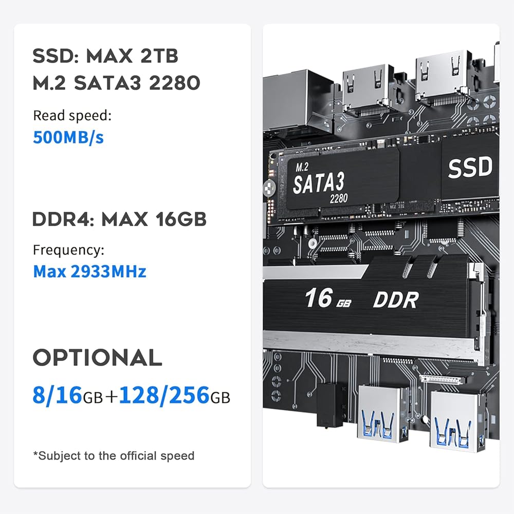 • DDR وSSD قابلان للترقية: تم تكوين كمبيوتر Beelink الصغير بذاكرة DDR4 بسعة 8 جيجابايت وSSD بسعة 256 جيجابايت. بالإضافة إلى ذلك، فهو يحتوي على فتحة Sodimm DDR4 2933 ميجاهرتز، وفتحة M.2 2280 SATA3 SSD وفتحة SATA HDD مقاس 2.5 بوصة (7 مم)، مما يسمح لك بتوسيع الذاكرة إلى حد أقصى 16 جيجابايت والتخزين إلى حد أقصى 2 تيرابايت.