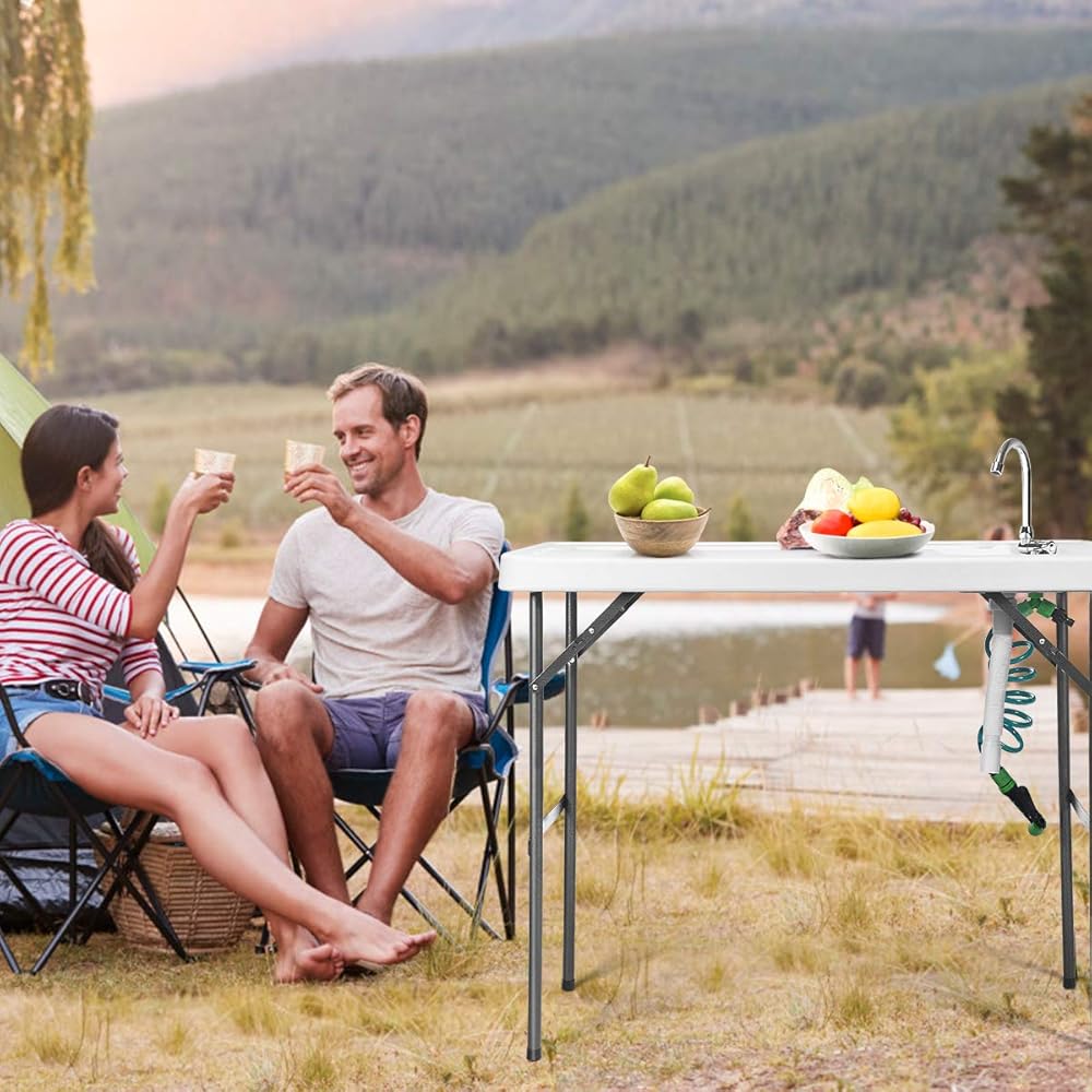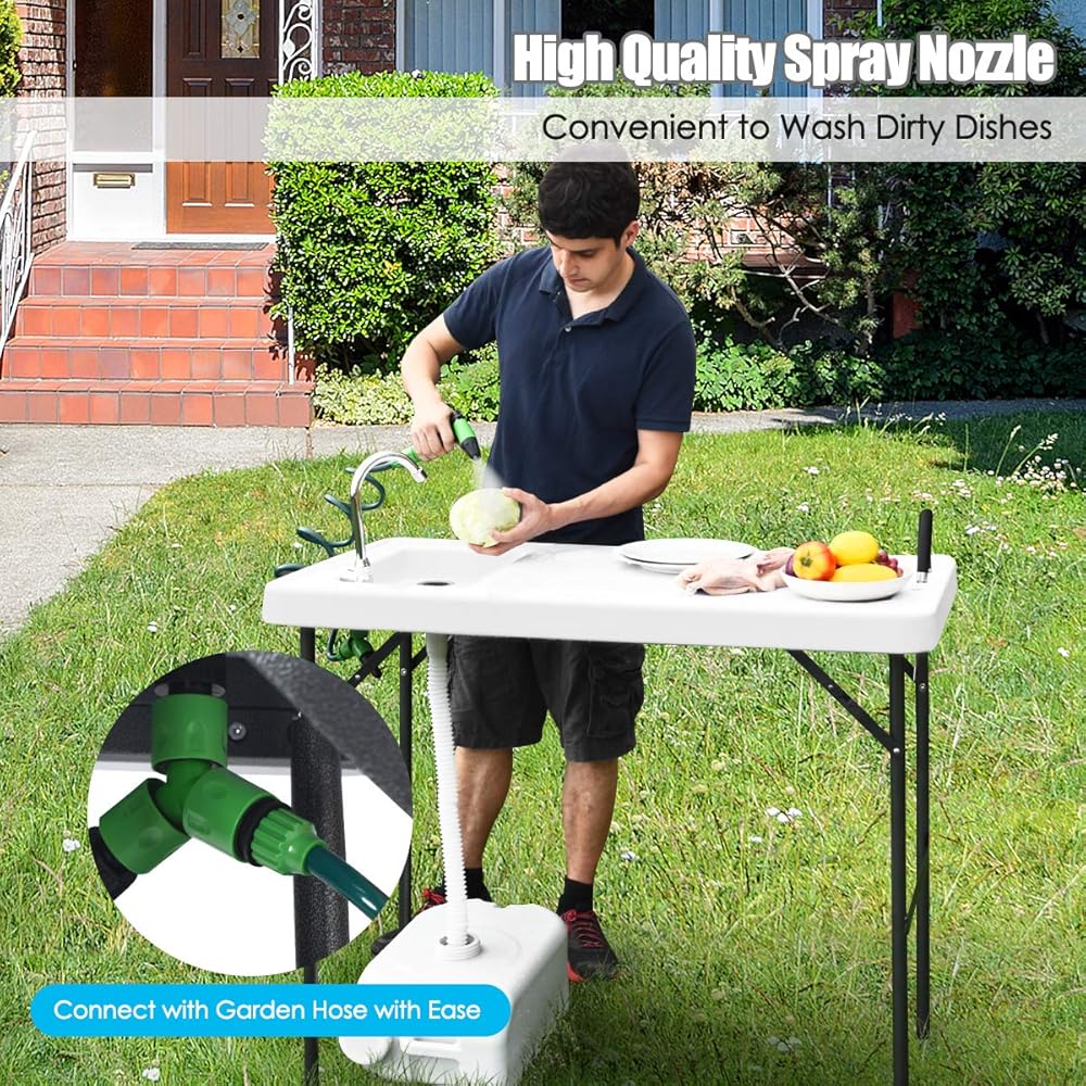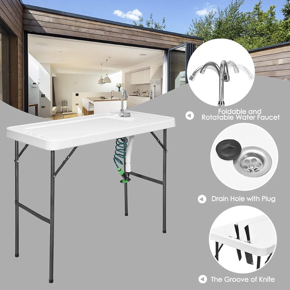 طاولة تنظيف الأسماك المحمولة من Goplus مع حوض، محطة حوض قابلة للطي للتخييم في الهواء الطلق مع خطاف خرطوم، طاولة فيليه شديدة التحمل مع صنبور لنزهة فناء الشاطئ