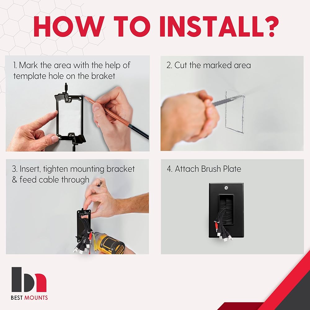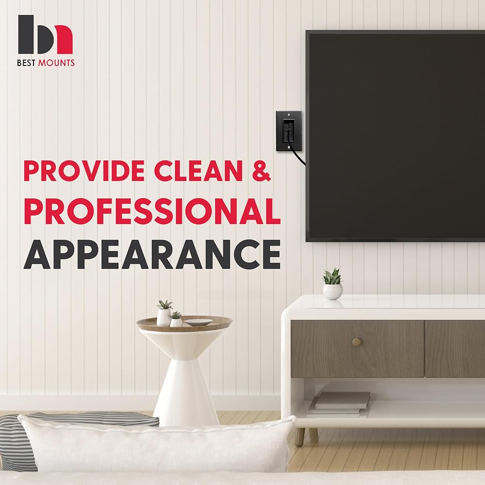 • تعتبر لوحة الحائط المصقولة بكابل Best Mount الحل الأمثل لتشغيل كابلات HDMI والكابلات المحورية وكابلات A/V القياسية وأسلاك السماعات وDVI وS-Video وكابلات الشبكة RJ45 والكابلات الأخرى ذات الجهد المنخفض من خلال الجدران إلى أجهزة التلفاز المسطحة، أنظمة الألعاب، أو أنظمة المسرح المنزلي