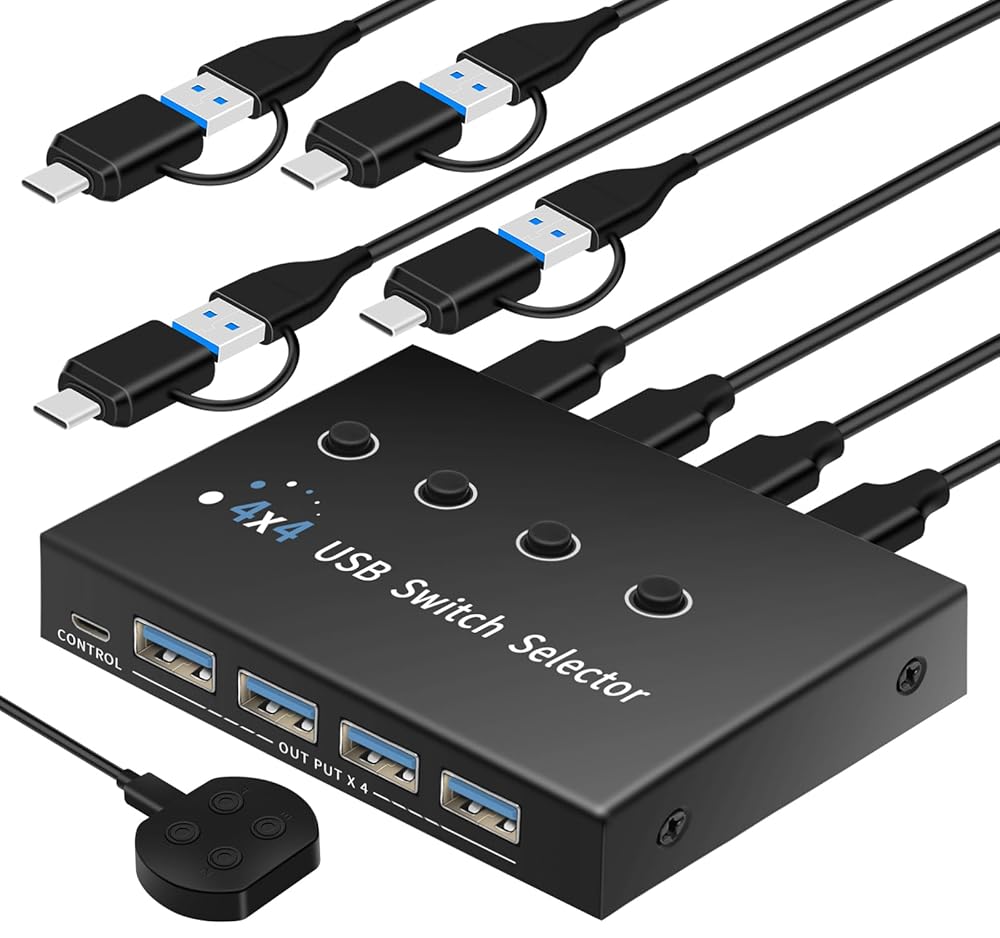 【مفتاح KVM مع 3 USB-A و1 USB-C】هذا مفتاح KVM يجمع بين مفتاح USB ومفتاح الشاشة في واحد. بالإضافة إلى مشاركة الشاشة، فهو يتميز أيضًا بأربعة منافذ USB3.0، بما في ذلك 3 USB-A و1 USB-C للتوافق مع المزيد من أجهزة USB، ومعدل نقل USB يصل إلى 5 جيجابت/ثانية، والذي يمكن استخدامه مشاركة الطابعة والماسح الضوئي وبطاقة صوت USB ولوحة المفاتيح والماوس. ملحوظة: منفذ USB-C لا يدعم نقل الفيديو.