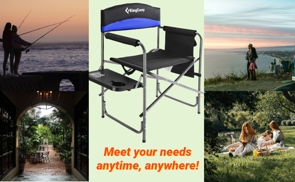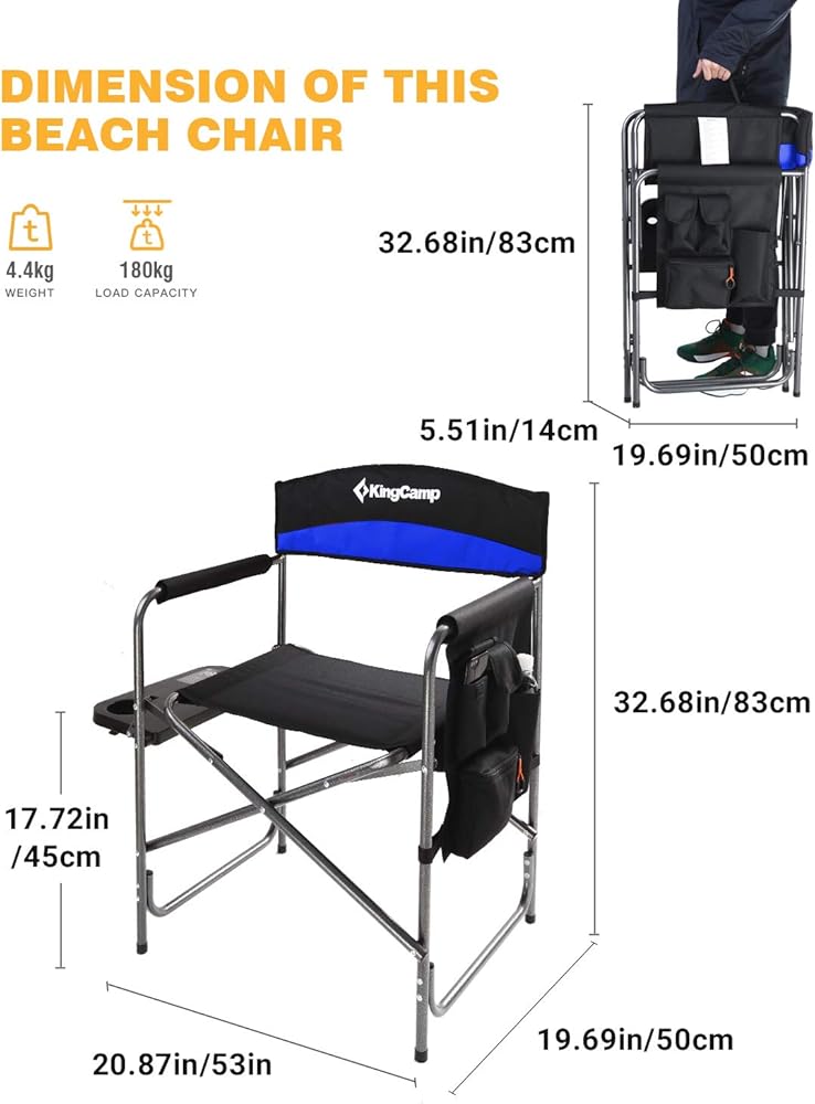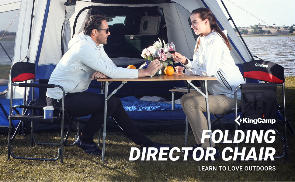 KingCamp heavy duty folding camp director chair with oversize padded seat, side table and pockets, which provides more comfort experience for outdoor camping hiking or other events!