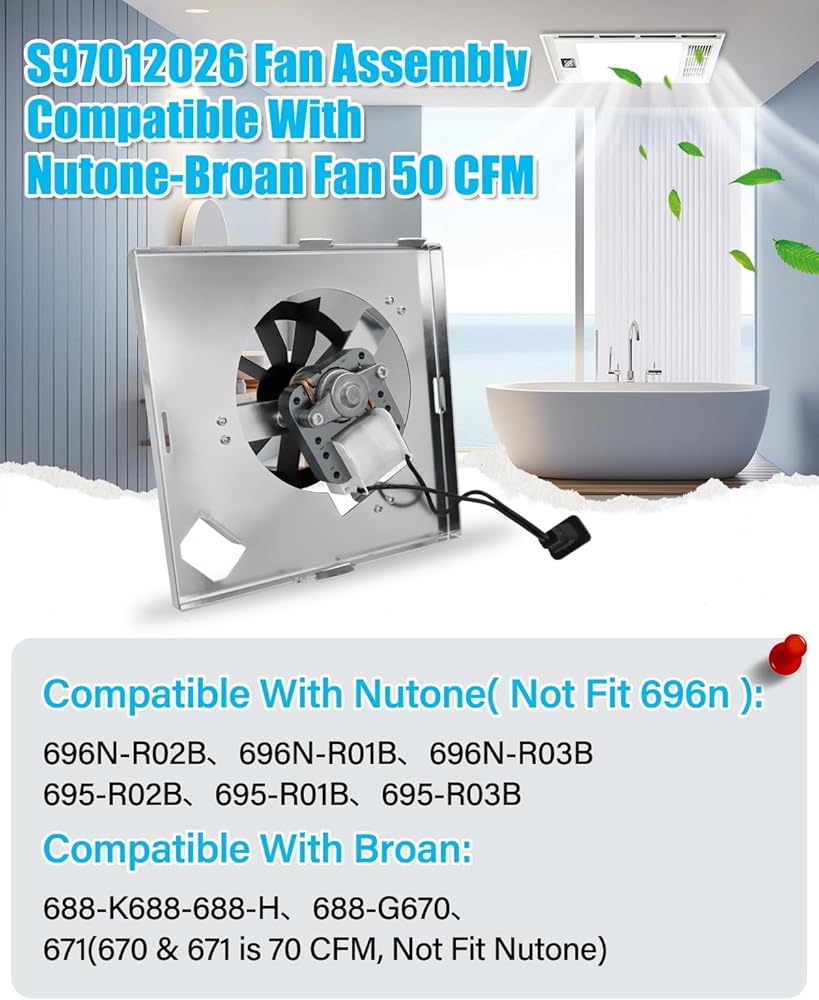 【تكيف مثالي】مروحة S97012026 متوافقة مع Nutone 696N-R02 B،695N-R02 B،696N-R01 B،695N-R01 B.متوافقة مع Broan 688-K 688-J 688-H 688-G ونماذج أخرى مع مروحة نفس الحجم: 7-1/4"x7-1/8".