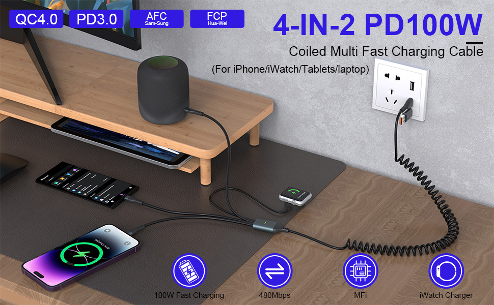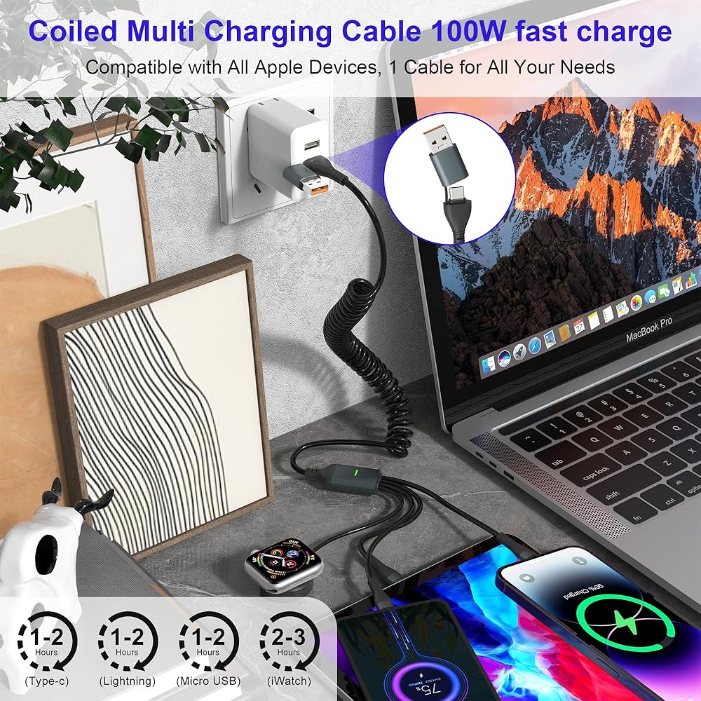 كابل شحن متعدد ملفوف 4 في 2 USB C لساعة Apple - كابل USB A/C متعدد 100 واط لساعة Apple ملفوف مع شاحن سفر Lightning/USB-C/Micro USB لسلسلة iWatch/Ultra/SE/iPhone16/15/14/Galaxy