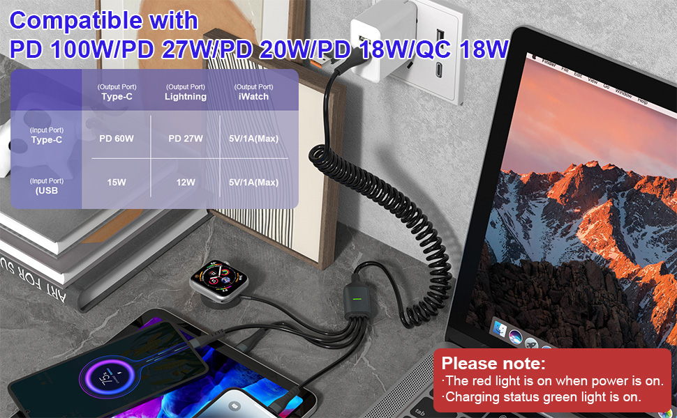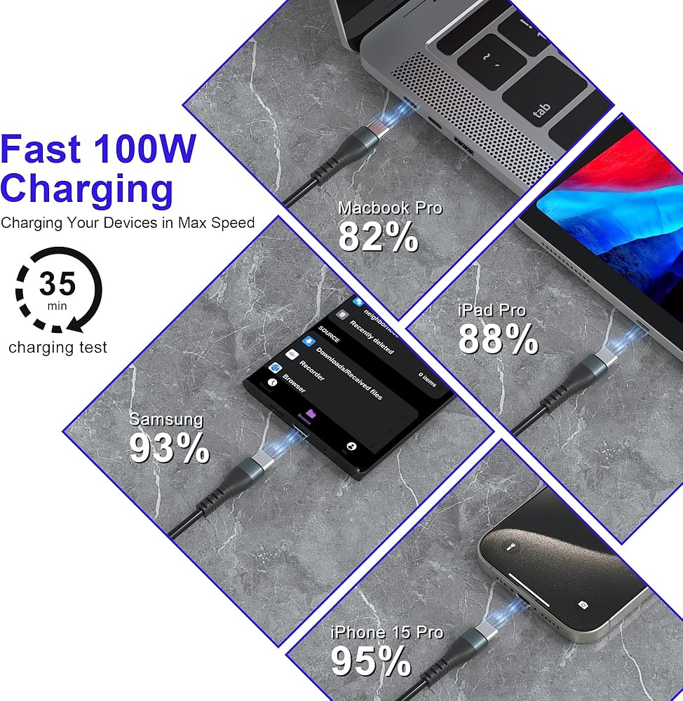 [سلك شاحن عالمي 100 واط]: يدعم كابل ساعة التفاح المتعدد هذا الشحن السريع 6A 100 واط PD. يمكنه شحن iPhone15 من 0% إلى 70% في 30 دقيقة وجهاز MacBook Pro إلى 100% في ساعة واحدة. ملاحظة: 1. يدعم مخرج Type-C فقط الشحن بقوة 100 وات ونقل البيانات بسرعة 480 ميجابت في الثانية، بينما تدعم المخارج الأخرى الشحن فقط. 2. تعتمد سرعة الشحن الفعلية على جهازك وشاحن الحائط.