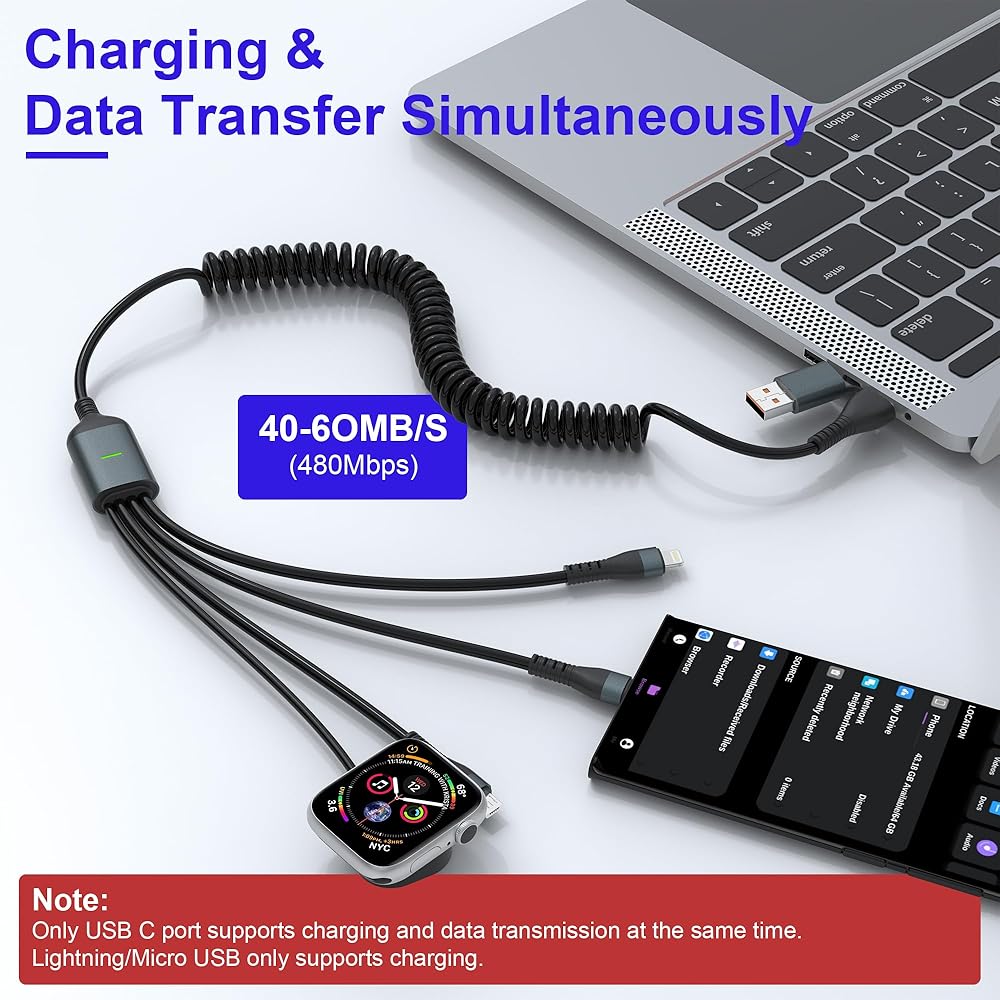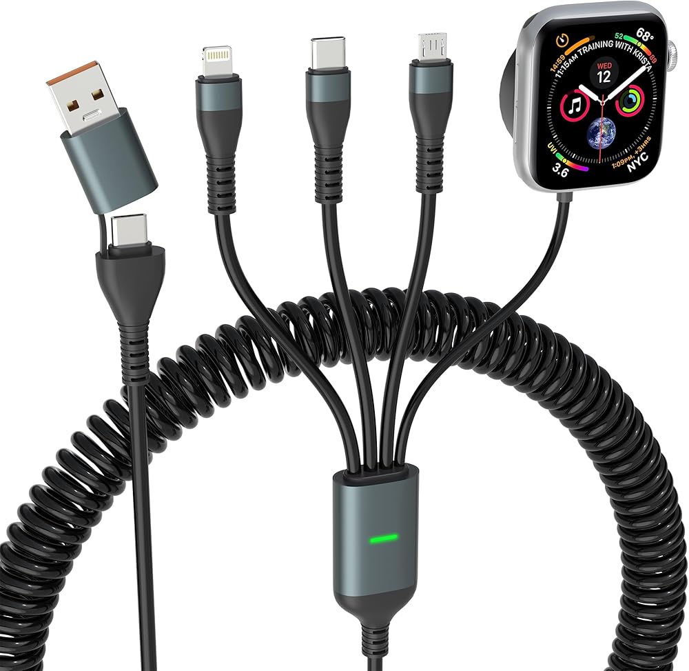 [كابل شحن ملفوف متعدد 4 في 2]: أحدث كابل متعدد 4 في 2 لشحن ما يصل إلى 4 أجهزة في وقت واحد، يتضمن كابل USB A/C إلى iWatch + كابل Lightning + كابل من النوع C + كابل Micro USB. ما عليك سوى أخذ كابل شاحن ساعة Apple الملفوف هذا عندما تكون في المكتب/المنزل/السفر/القيادة، واشحن ساعتك وهاتفك في أي وقت.