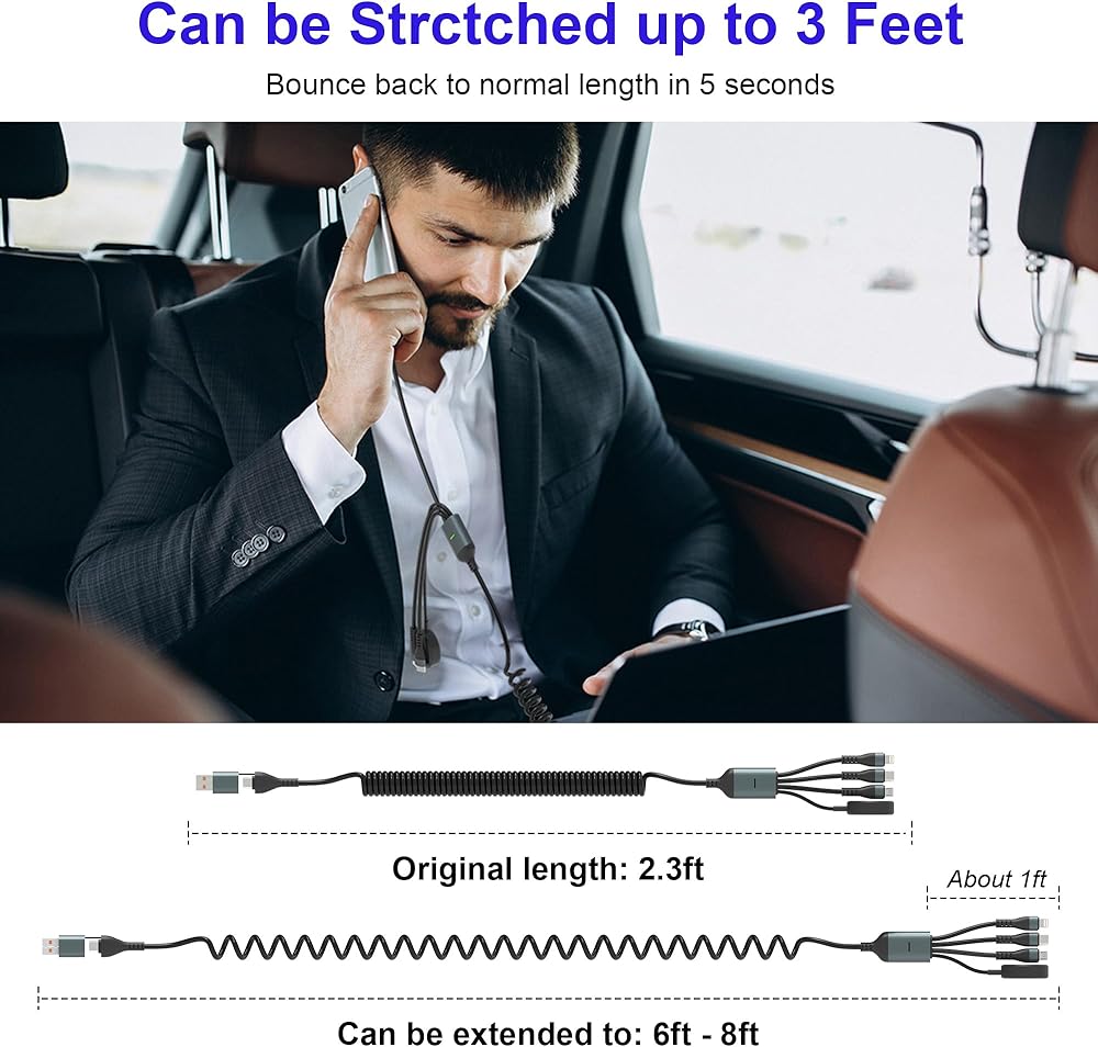 [كابل ملفوف قابل للسحب]: يتميز كابل usb c الملفوف المتعدد بتصميم مبتكر قابل للسحب حيث يبلغ طول الاستخدام المريح 6-8 أقدام. نظرًا لتصميم الملف الزنبركي، يمكن لكابل الشحن المتعدد القابل للسحب أن يمنع التشابك والعقد، مما يحافظ على سطح المكتب مرتبًا. كابل USB متعدد ملفوف يمكن وضعه بسهولة في حقيبة الظهر وهو مناسب للاستخدام في السفر والمنزل والمكتب.