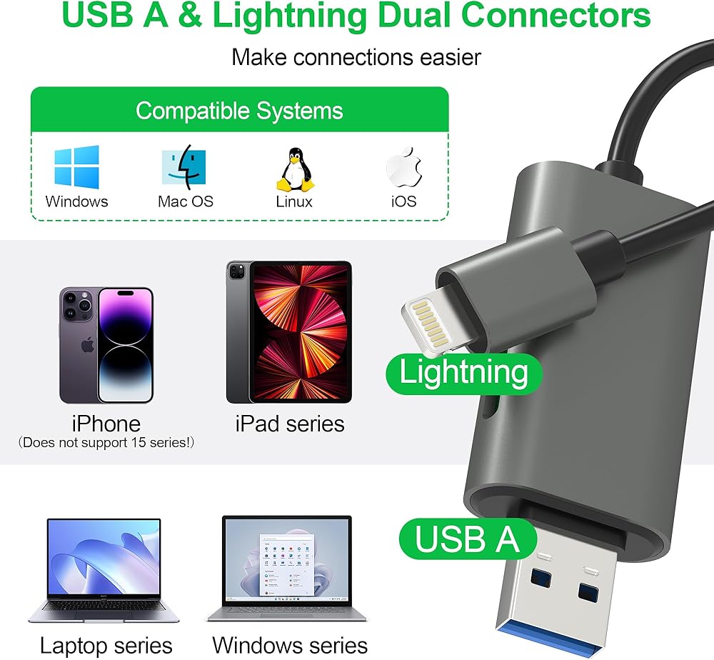 قارئ بطاقات Lightning وUSB-A مزدوج: يجمع قارئ بطاقة sd هذا بين منافذ Lightning وUSB-A ليمنحك مجموعة واسعة من خيارات الاتصال. سواء كنت تستخدم iPhone 14/14 Pro/14 Pro Max/13/13 Mini/13 Pro/13 Pro Max/12 Mini/12/12 Pro/12 Pro Max/11/XR/XS/X/8/7/ 6/5 جهاز كمبيوتر أو كمبيوتر أو أجهزة أخرى تدعم USB-A، يمكنك نقل البيانات ومشاركتها بسهولة (iPhone15/16 غير مدعوم)