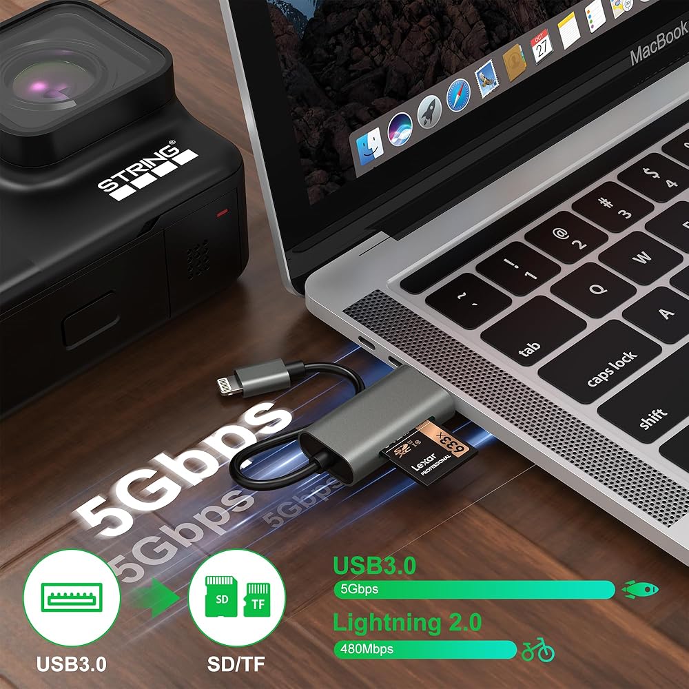 نقل سريع للبيانات: تتميز واجهة USB-A3.0 بمعدل نقل يصل إلى 5 جيجابت في الثانية، وتتميز واجهة Lightning بمعدل نقل يصل إلى 480 ميجابت في الثانية. ولكن بغض النظر عن الواجهة التي تستخدمها، يمكن أن يوفر قارئ بطاقات Lightning إلى SD سرعات نقل بيانات سريعة، مما يسمح لك بنقل كميات كبيرة من البيانات بسرعة من البطاقة إلى جهاز كمبيوتر أو جهاز آخر