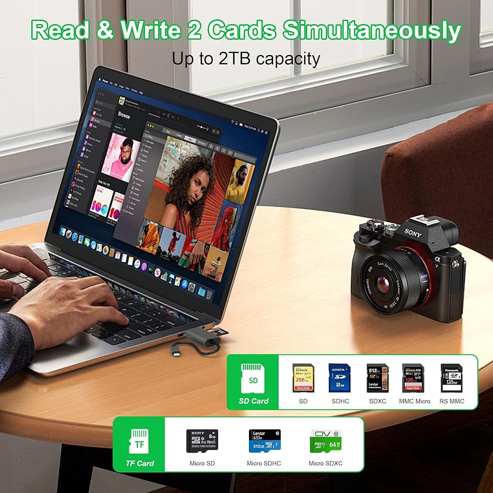 قراءة بطاقة SD/TF في وقت واحد: يدعم محول بطاقة USB إلى sd سعة البطاقة حتى 2 تيرابايت، متوافق مع بطاقات SD وSDXC وSDHC وMMC وRS-MMC وMicro SDXC وMicro SD وMicro SDHC وUHS-I، ويدعم في وقت واحد قراءة بطاقتين، مما يقلل من المتاعب الناجمة عن التوصيل والفصل المتكرر