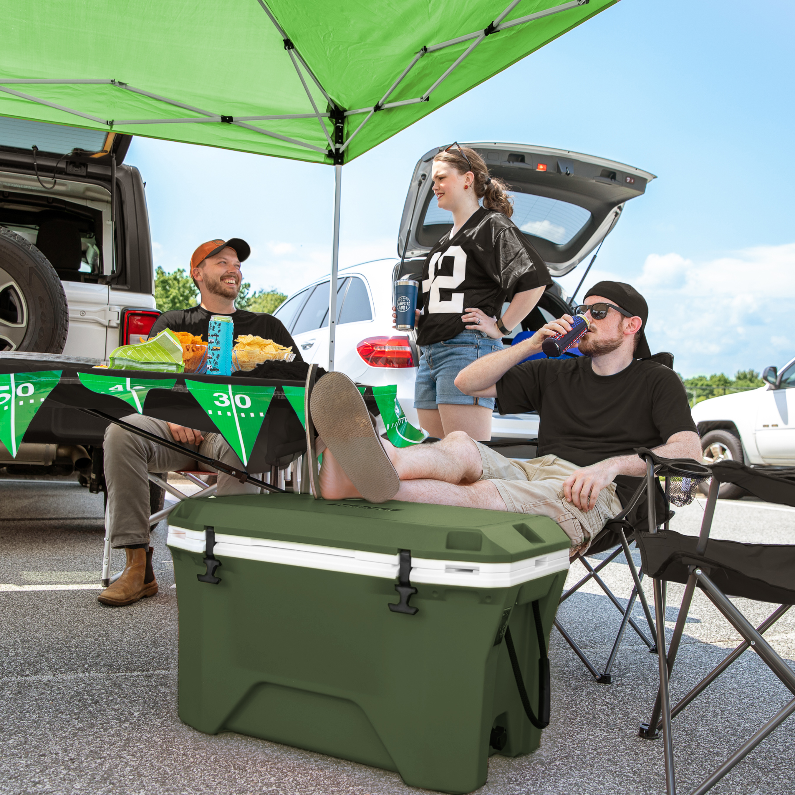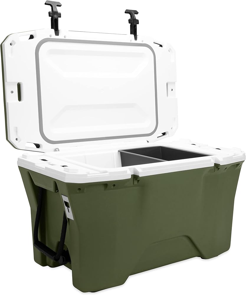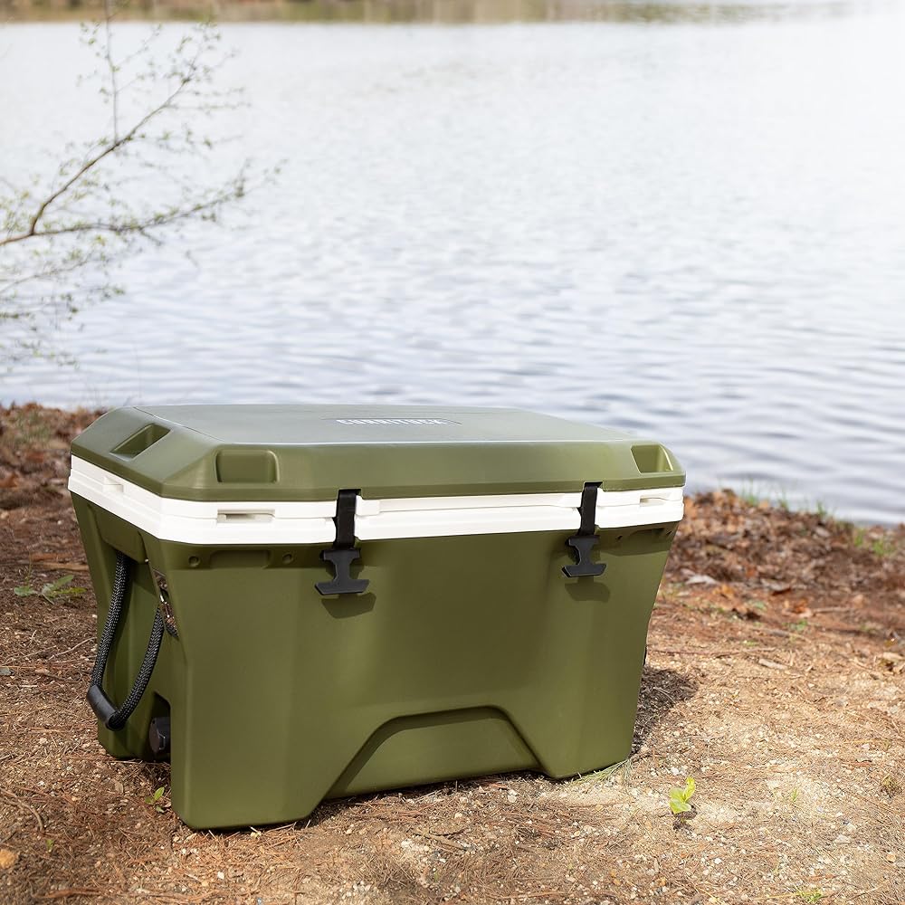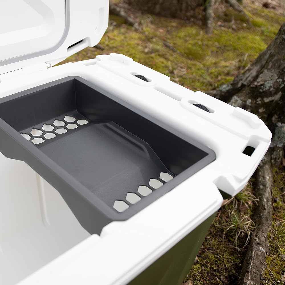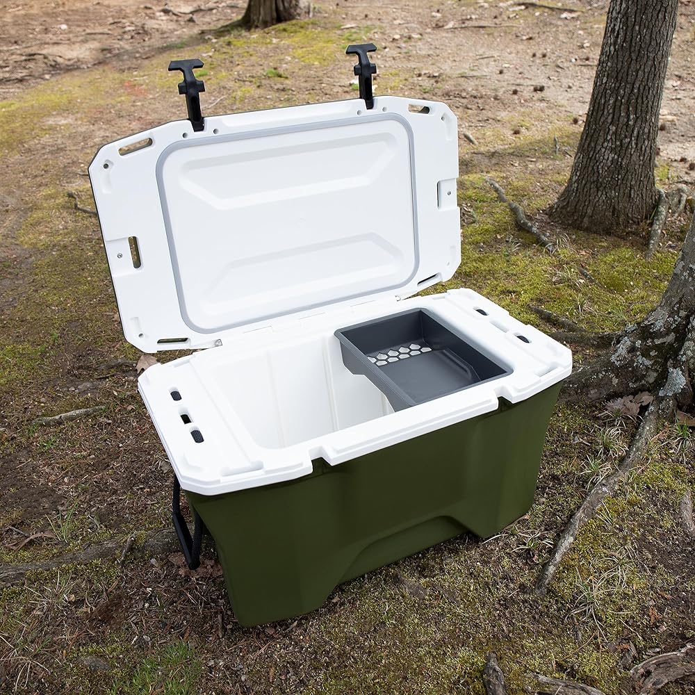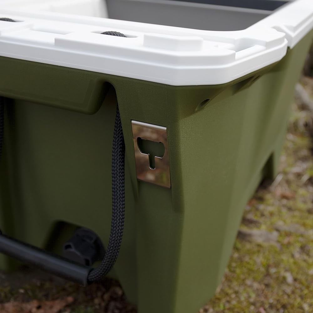 Currituck's 30-Quart Premium Coolers are tough, rugged and ideal for all of your daily adventures. Take it with you camping, boating, tailgating or even just out on the patio. This cooler features an ultra-durable design with stainless steel hardware and impact modified polymer resin. A consistent wall thickness and freezer-grade seal help allow up to 10 days of ice retention. Included are (2) rope handles with ergonomic grip, (6) tie-down points, (2) bottle openers, and (1) storage tray. Also includes built-in slots for Currituck cup holders, fishing rod holders, dry baskets and divider accessories. Holds up to 28 cans and 18 lb of ice. Measures 27-inches wide x 15 ½-inches deep x 17-inches tall. Color: Gator Bone (green/white). Made in the USA.