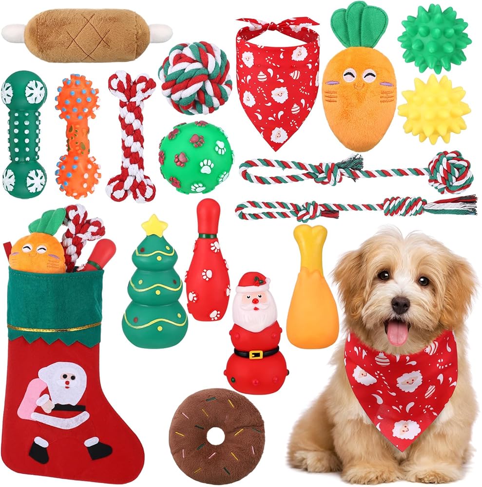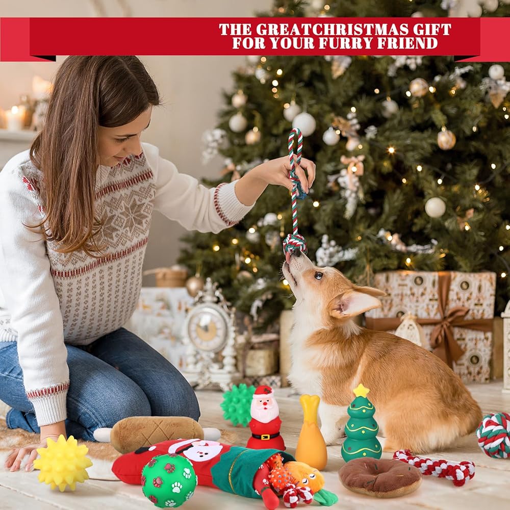 This dog Christmas stocking with toys comes packed with 1 large Christmas stockings, 9 sounding toys, 4 cotton rope toys, 3 plush sounding toys and a pet bib, offering your dog an array of play options and adding fun to the holiday season.