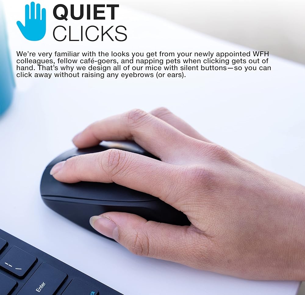 النقرات الهادئة: نحن على دراية كبيرة بالمظهر الذي تتلقاه من زملائك المعينين حديثًا في WFH، وزملائك من رواد المقاهي، والحيوانات الأليفة التي تأخذ قيلولة عندما يخرج النقر عن نطاق السيطرة. ولهذا السبب قمنا بتصميم جميع أجهزة الماوس لدينا بأزرار صامتة، بحيث يمكنك النقر بعيدًا دون رفع أي حاجبين (أو أذنين).