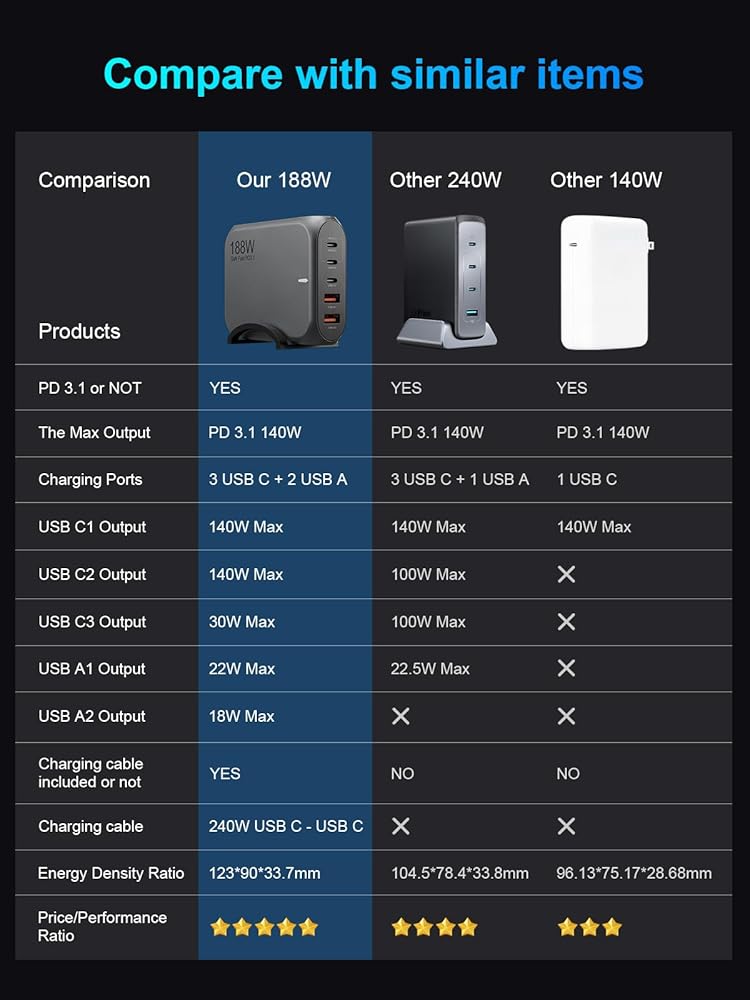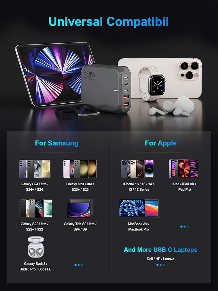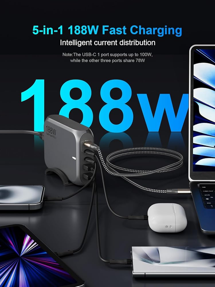 شاحن سطح المكتب USB C بقوة 188 واط، 5 منافذ متوافق مع MacBook Pro/Air iPad Pro/Air iPhone 15 14 13 12 Samsung Galaxy S24 S23 S22 Dell والمزيد 140 واط USB C PD 3.1 محطة شحن