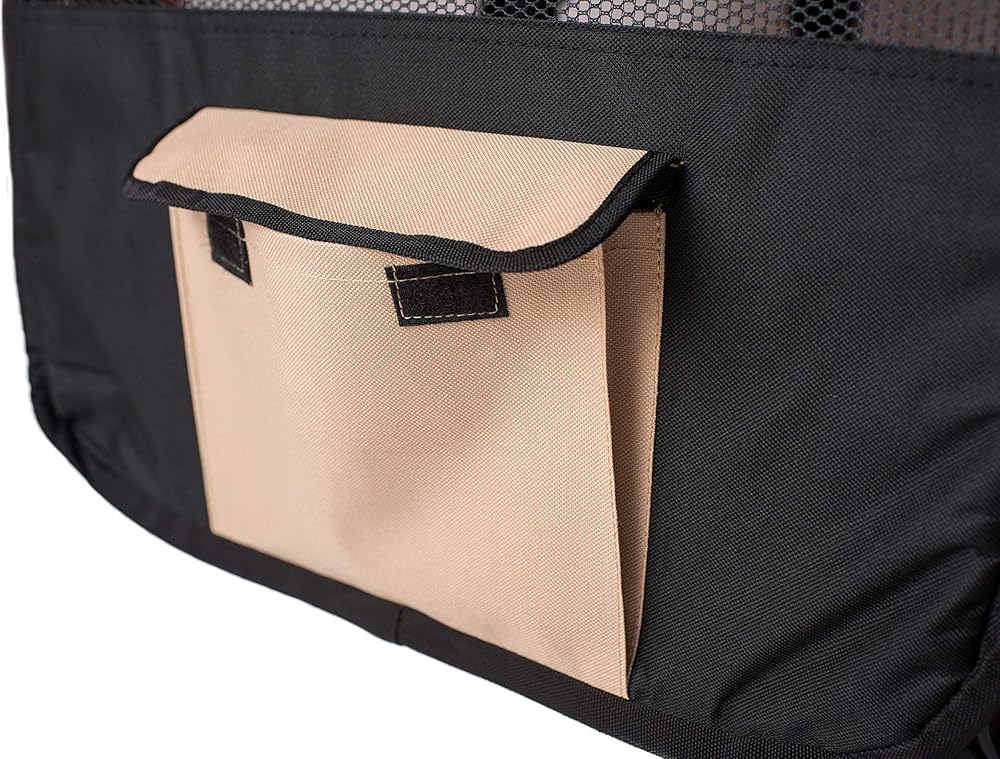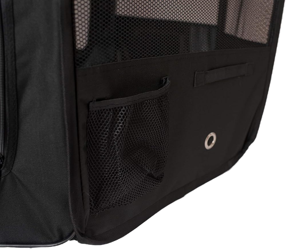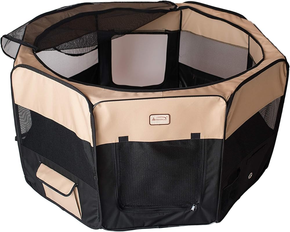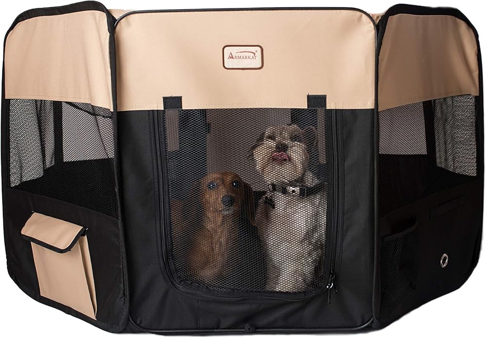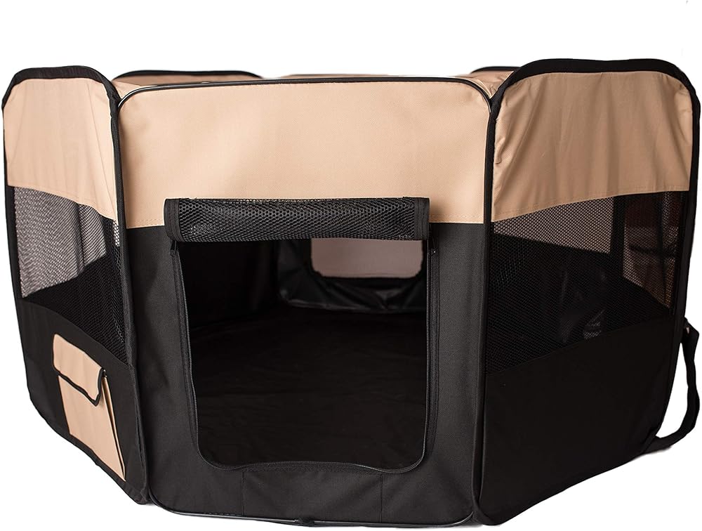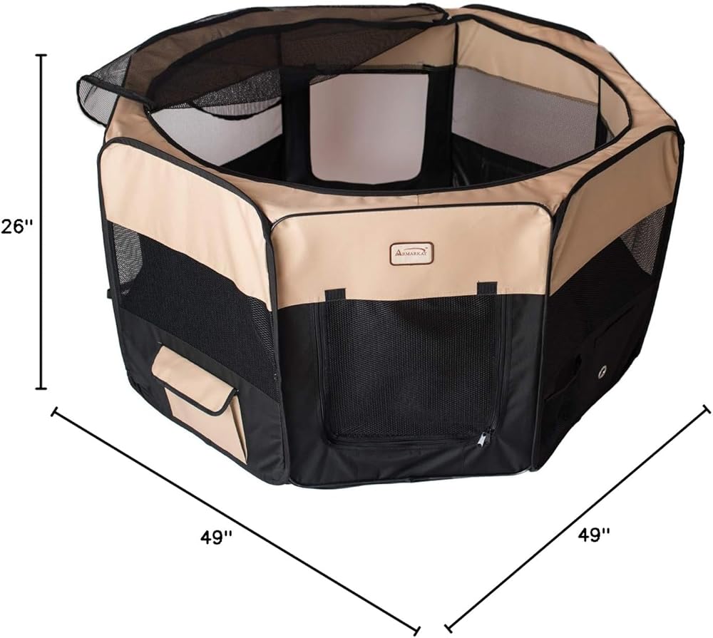 The new Ararat model PP003BGE-XL portable playpen is perfect for kittens, puppies, or a group of playful Chihuahuas. Available in a stunning color combination of black and Beige, This travel playpen comes complete with extra-strong polyester fabric with mesh vents for air and visibility. Model PP003BGE-XL has a convenient zip-off top and exterior pockets for toy and treat storage. With a net weight of 7 lbs. , The durable pet pen can be used indoors or outdoors. It sets up quickly and folds flat to fit in an included polyester carry bag. Dimensions: 49"(l) x 49"(w) x 26"(h)