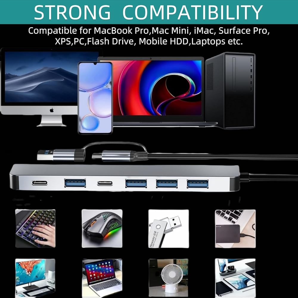 • 【7-in-1 Multi-functional Hub】: USB-C hub featuring 1 USB 3.0 port, 4 USB 2.0 ports, and 2 USB-C 2.0 ports. USB 3.0 offers 5Gb/s transfer speed, while USB 2.0 provides 480Mbps transfer speed, enabling rapid transfer and download of videos, music, photos, and other files.