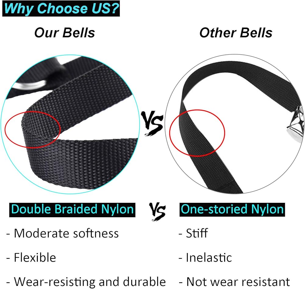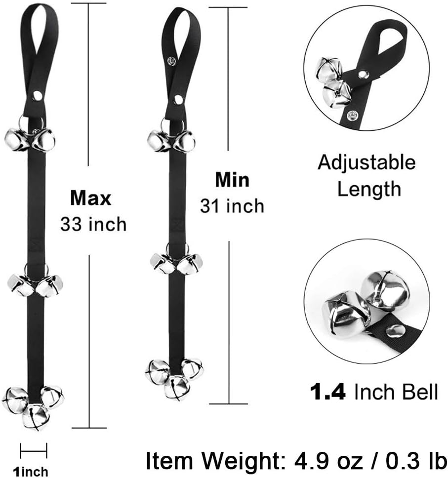 【طول قابل للتعديل】: طول جرس الباب قابل للتعديل للكلاب الصغيرة والمتوسطة والكبيرة. طول الحزام قابل للتعديل: من 31 بوصة إلى 33 بوصة. يمكن تعديل الطول بسهولة ليناسب الأنواع المختلفة من مقبض الباب، أو المقبض، أو الخطاف.
