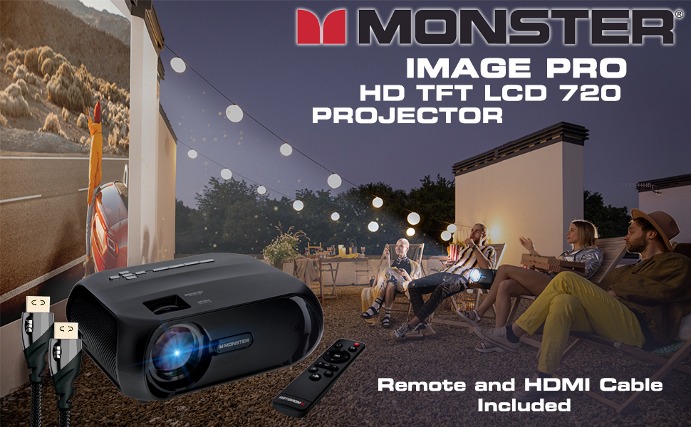 جهاز عرض Monster Image Pro 720 HD LCD فائق السطوع، 2000 لومن، مشاريع تصل إلى 16 قدمًا، الدقة القصوى: 1080 HD، دعم عالمي للصور/الصوت/الفيديو، مدخل AV/USB/HDMI/SD
