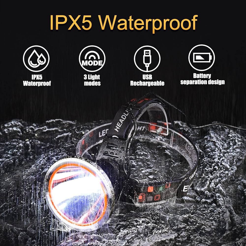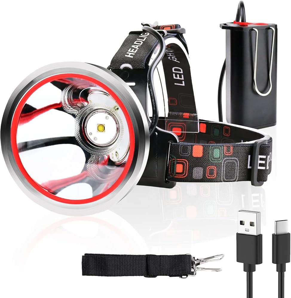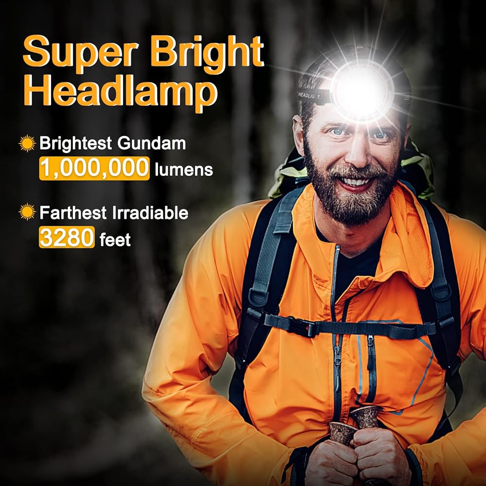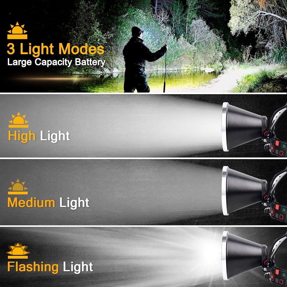 مصباح أمامي قابل لإعادة الشحن، مصباح أمامي فائق السطوع 100000 لومن، مصابيح أمامية LED قوية للبالغين، وضعان لمصابيح الرأس للتخييم في الهواء الطلق وصيد الأسماك والمشي لمسافات طويلة