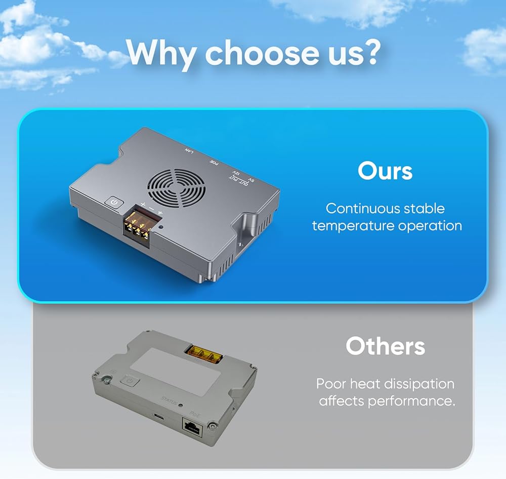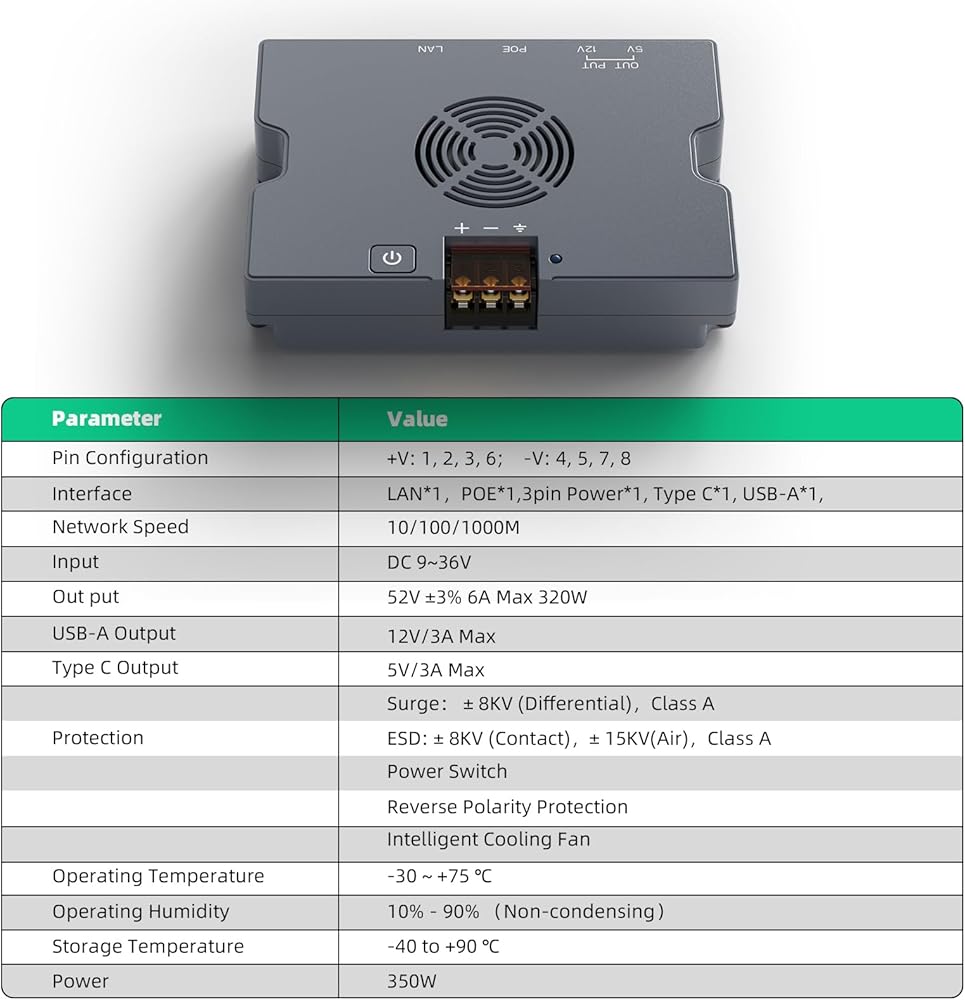 180W GigE Passive PoE Injector: Delivers a robust 180W output with a DC input range of 9-36V, supporting high-power devices and offering Gigabit Ethernet (1000Mbps) for efficient PoE power transmission—ideal for devices that need dependable power and fast network speeds.