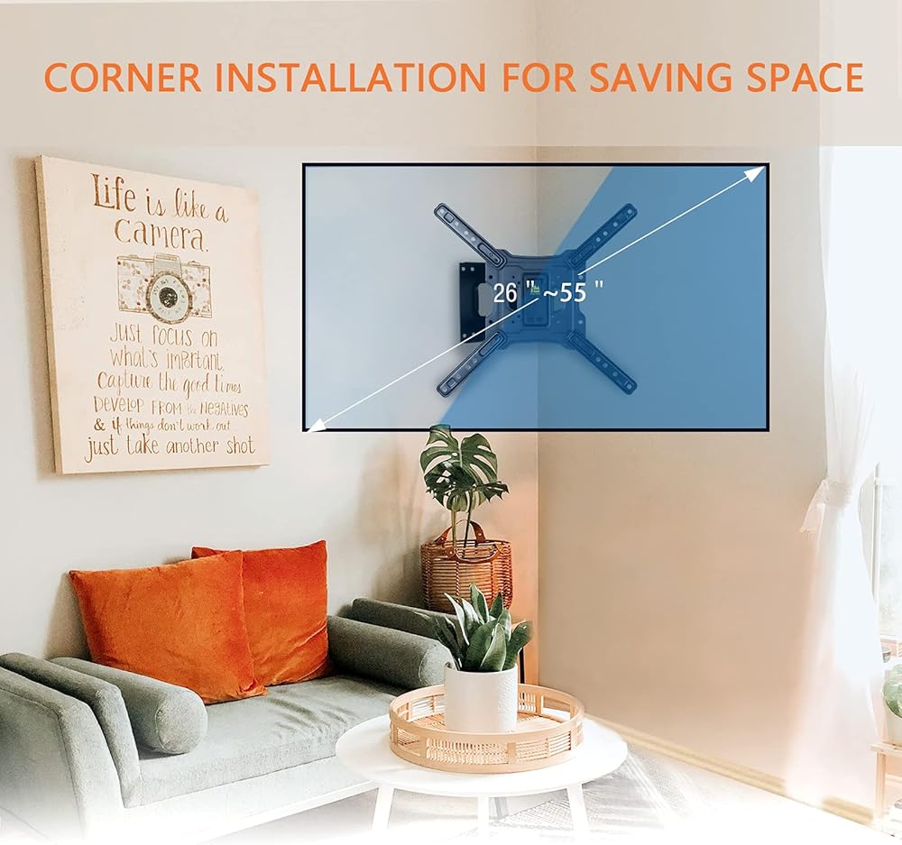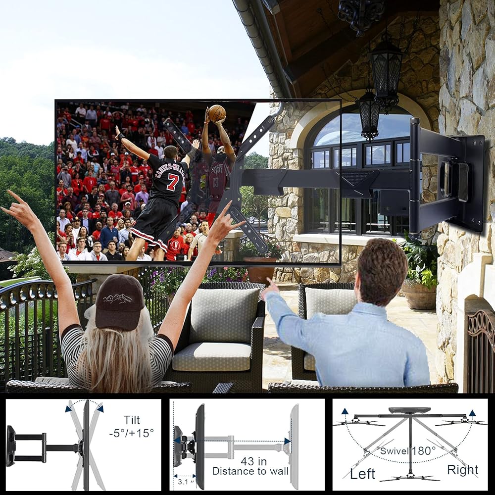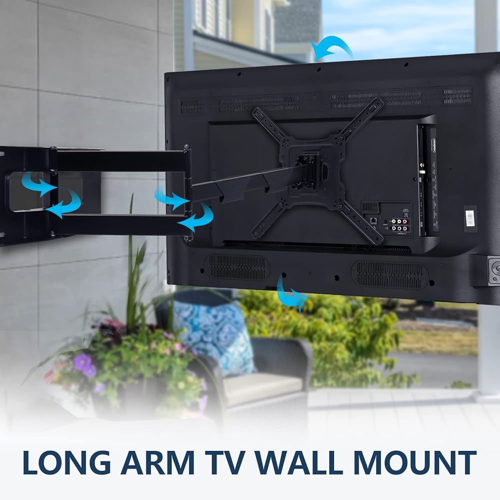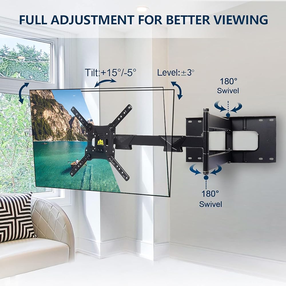 التعديل الكامل: حركة كاملة، وتمتد، وتفصل، وتميل، وتدور، ومستويات وتطوى على حامل التلفزيون ذو الحركة الكاملة ذو الذراع الطويلة. مما يجعلها مثالية للتركيب في الزاوية، أو فوق المدفأة، أو داخل مركز التلفزيون. يضمن التصميم البسيط أن يكون التلفزيون قريبًا من الحائط للحصول على لمسة نهائية أنيقة. كما يتم تضمين إدارة الكابلات.